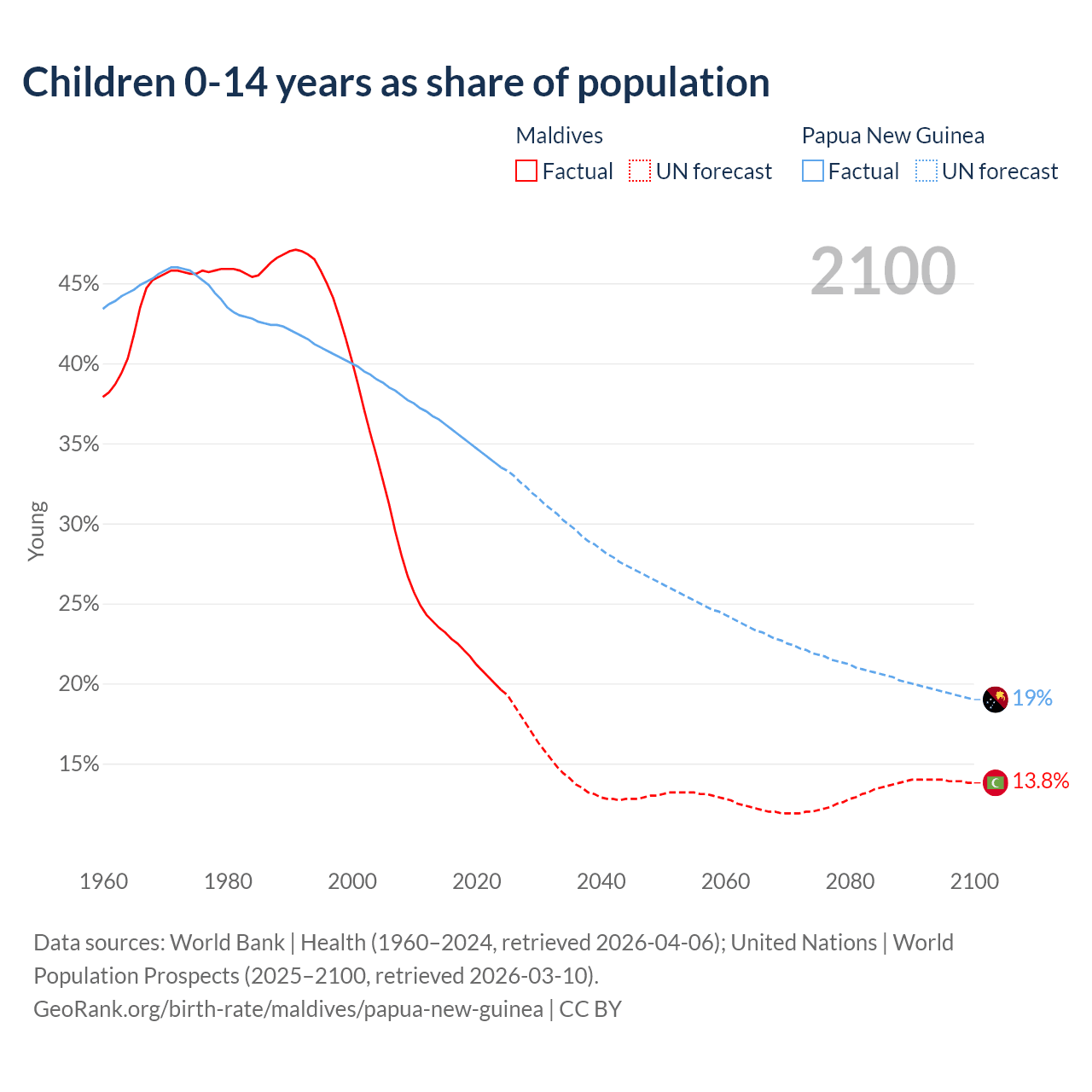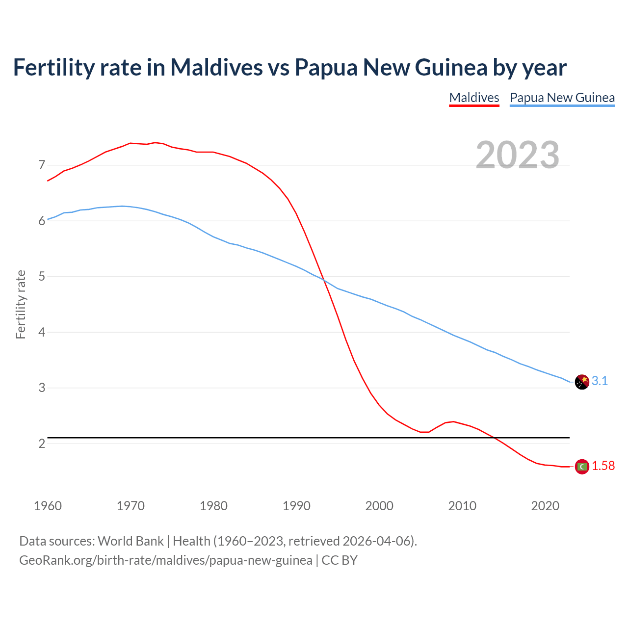 According to the latest available data on birth rates, the fertility rate in Maldives was 1.58 children per woman in 2023, compared to 3.1 in Papua New Guinea in 2023. The replacement level is considered to be 2.1 children per woman.