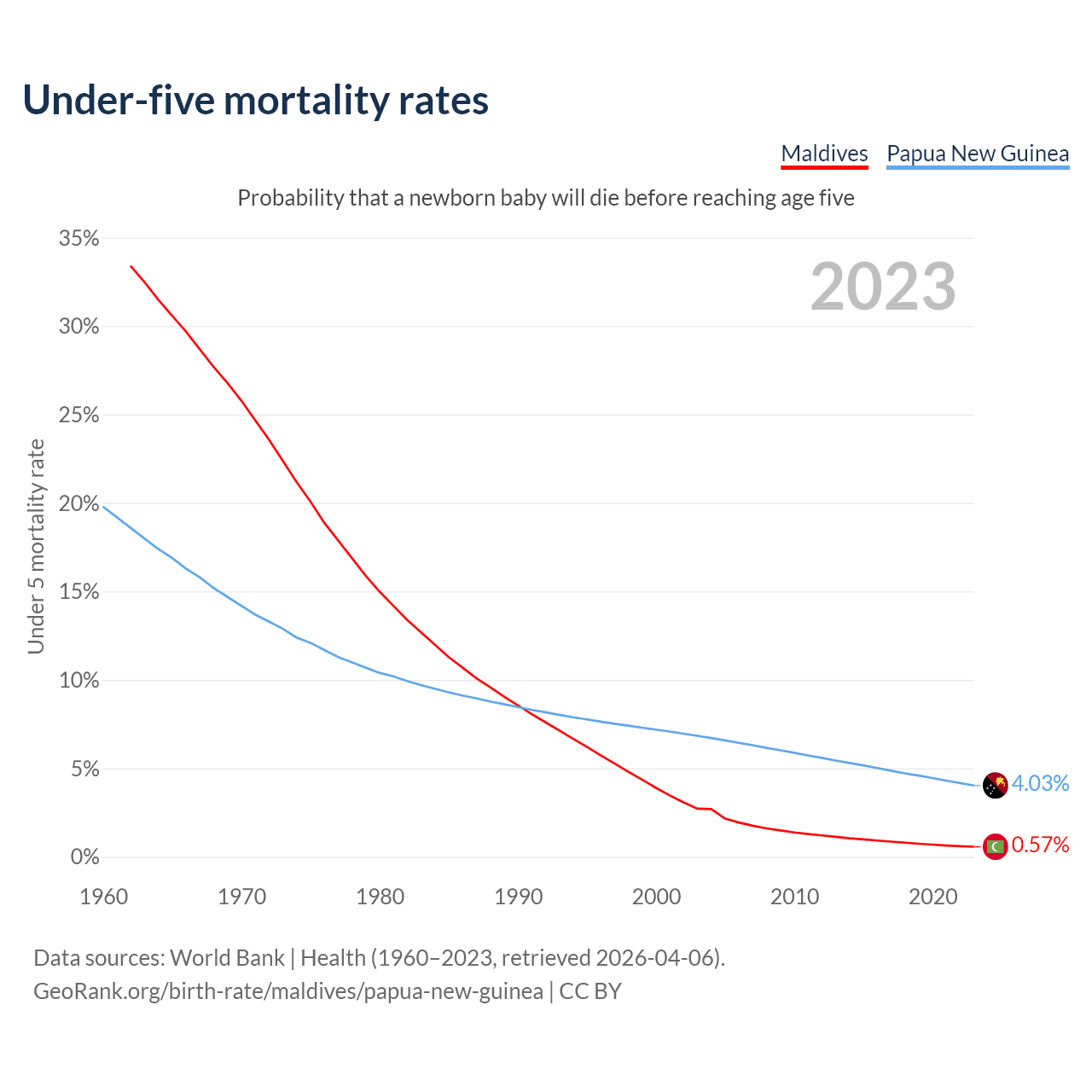 The chance that a newborn baby will die before reaching age five is 0.57% in Maldives and 4.03% in Papua New Guinea. Above is a chart with historical data on under-five mortality rates.