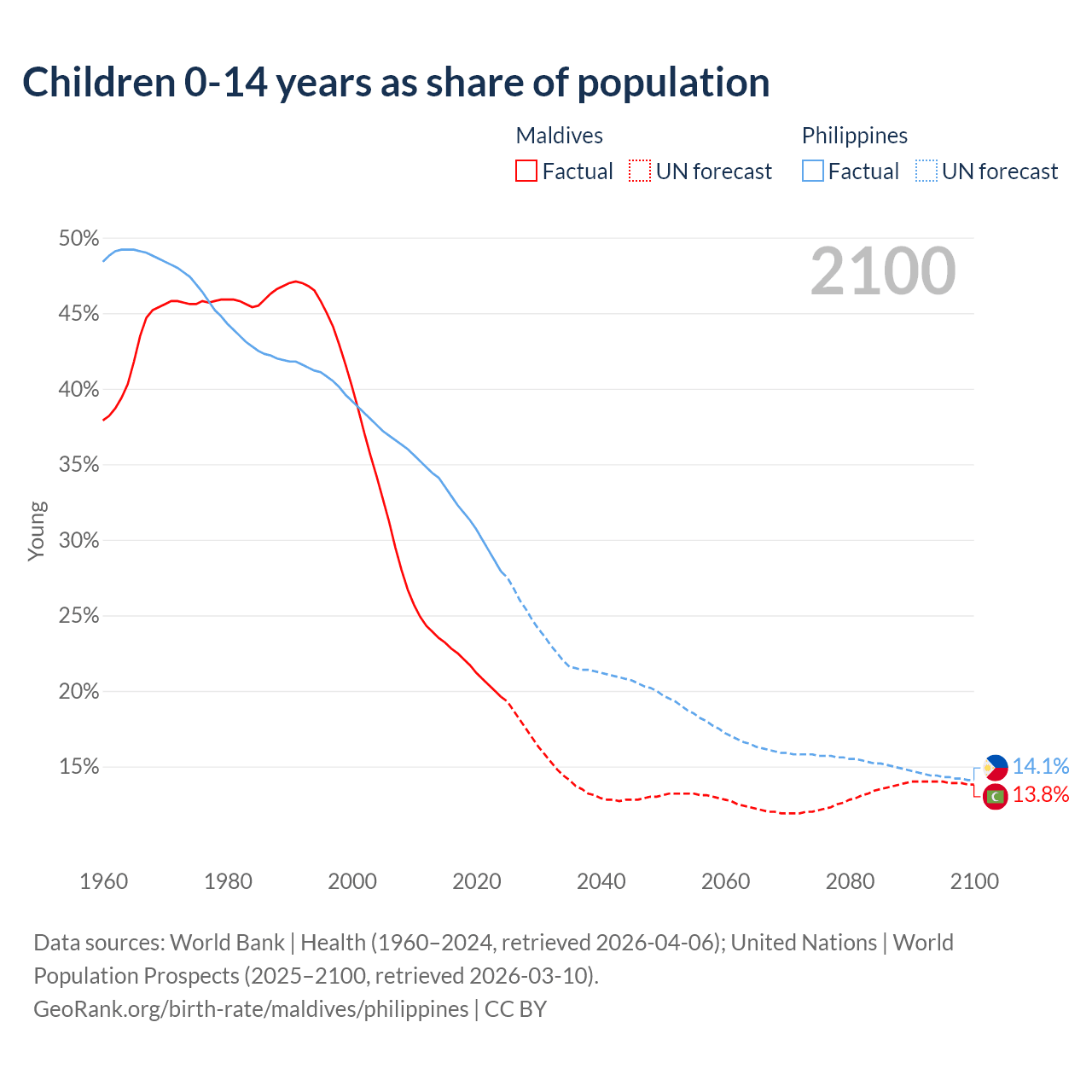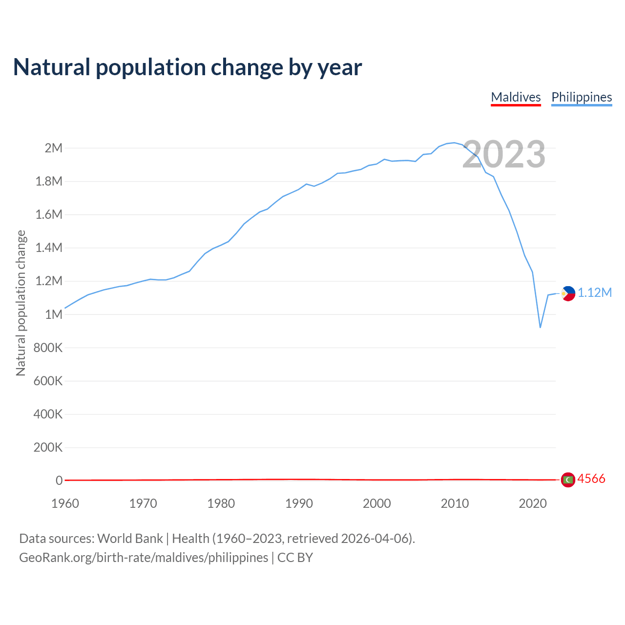 According to the latest available data on birth rates, the fertility rate in Maldives was 1.58 children per woman in 2023, compared to 1.92 in the Philippines in 2023. The replacement level is considered to be 2.1 children per woman.