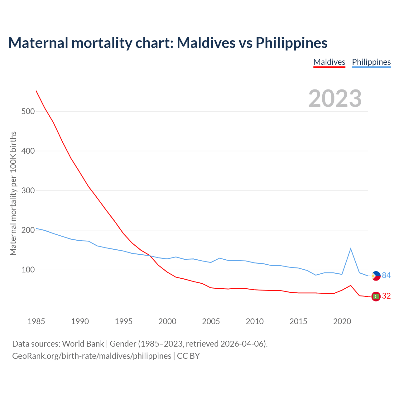The maternal mortality rate, which is the probability of dying during childbirth or within 42 days of pregnancy termination, is 32 deaths per 100,000 live births in Maldives, compared to 84 deaths in the Philippines.
