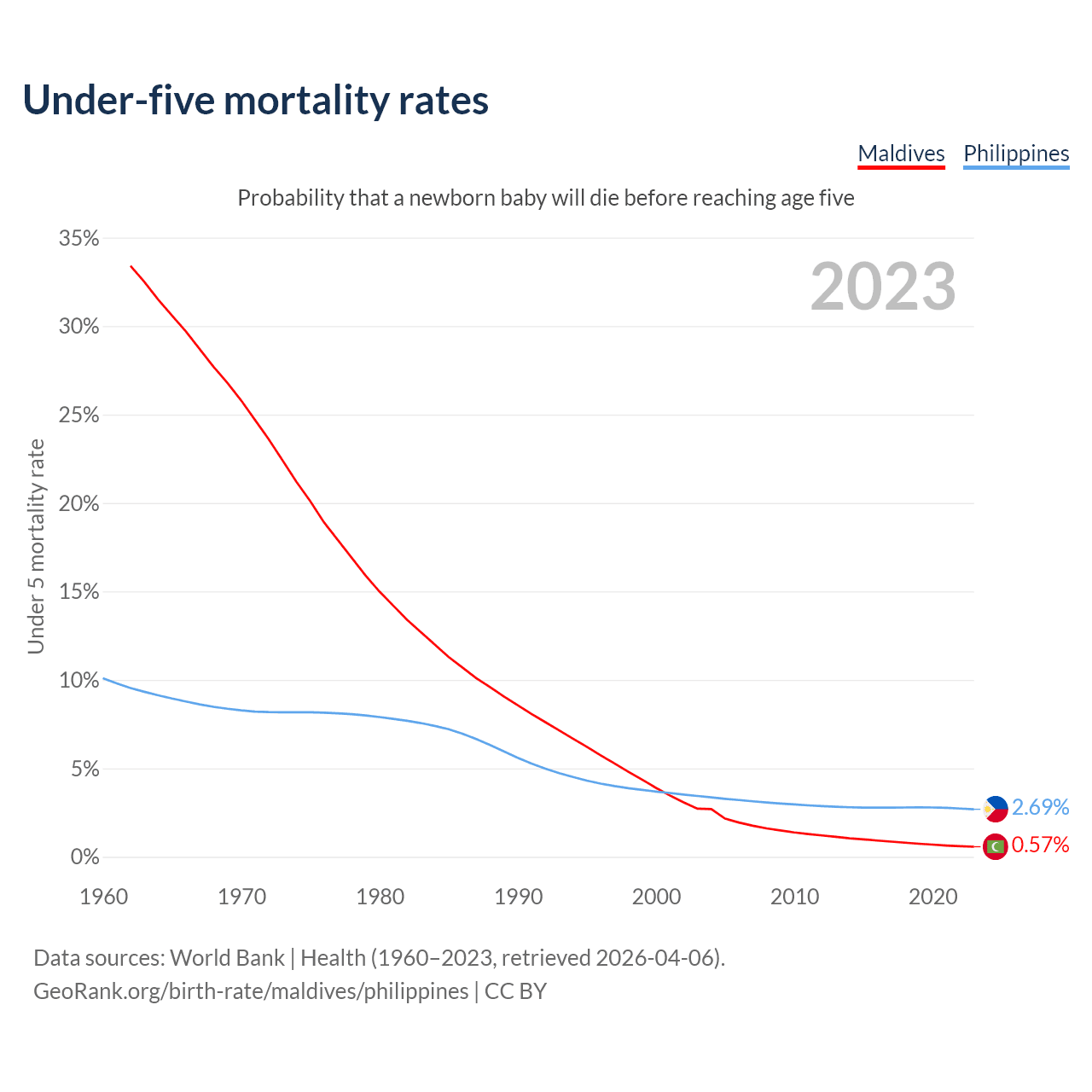 The chance that a newborn baby will die before reaching age five is 0.57% in Maldives and 2.69% in the Philippines. Above is a chart with historical data on under-five mortality rates.