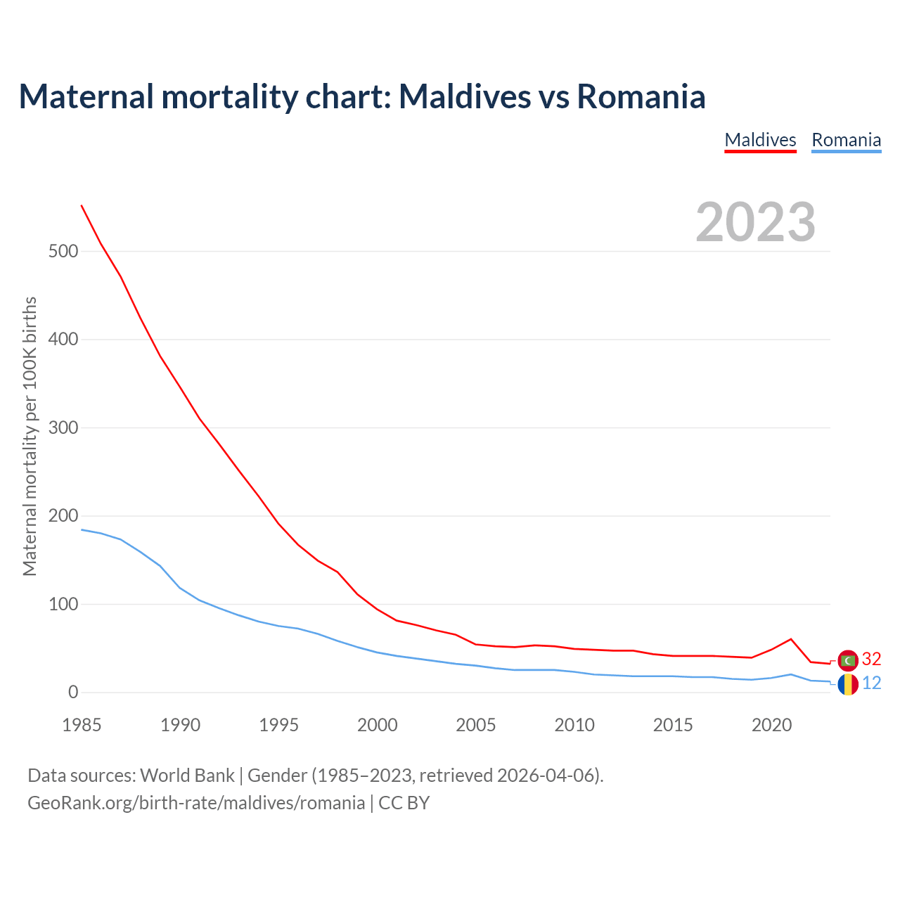 The maternal mortality rate, which is the probability of dying during childbirth or within 42 days of pregnancy termination, is 32 deaths per 100,000 live births in Maldives, compared to 12 deaths in Romania.