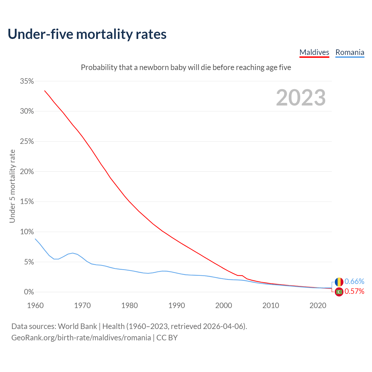 The chance that a newborn baby will die before reaching age five is 0.57% in Maldives and 0.66% in Romania. Above is a chart with historical data on under-five mortality rates.
