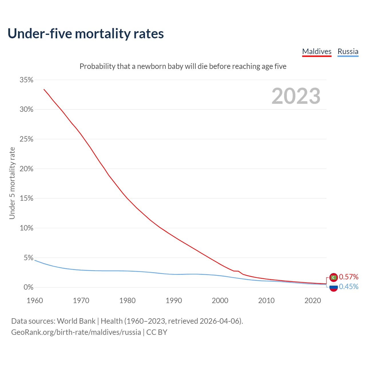 The chance that a newborn baby will die before reaching age five is 0.57% in Maldives and 0.45% in Russia. Above is a chart with historical data on under-five mortality rates.