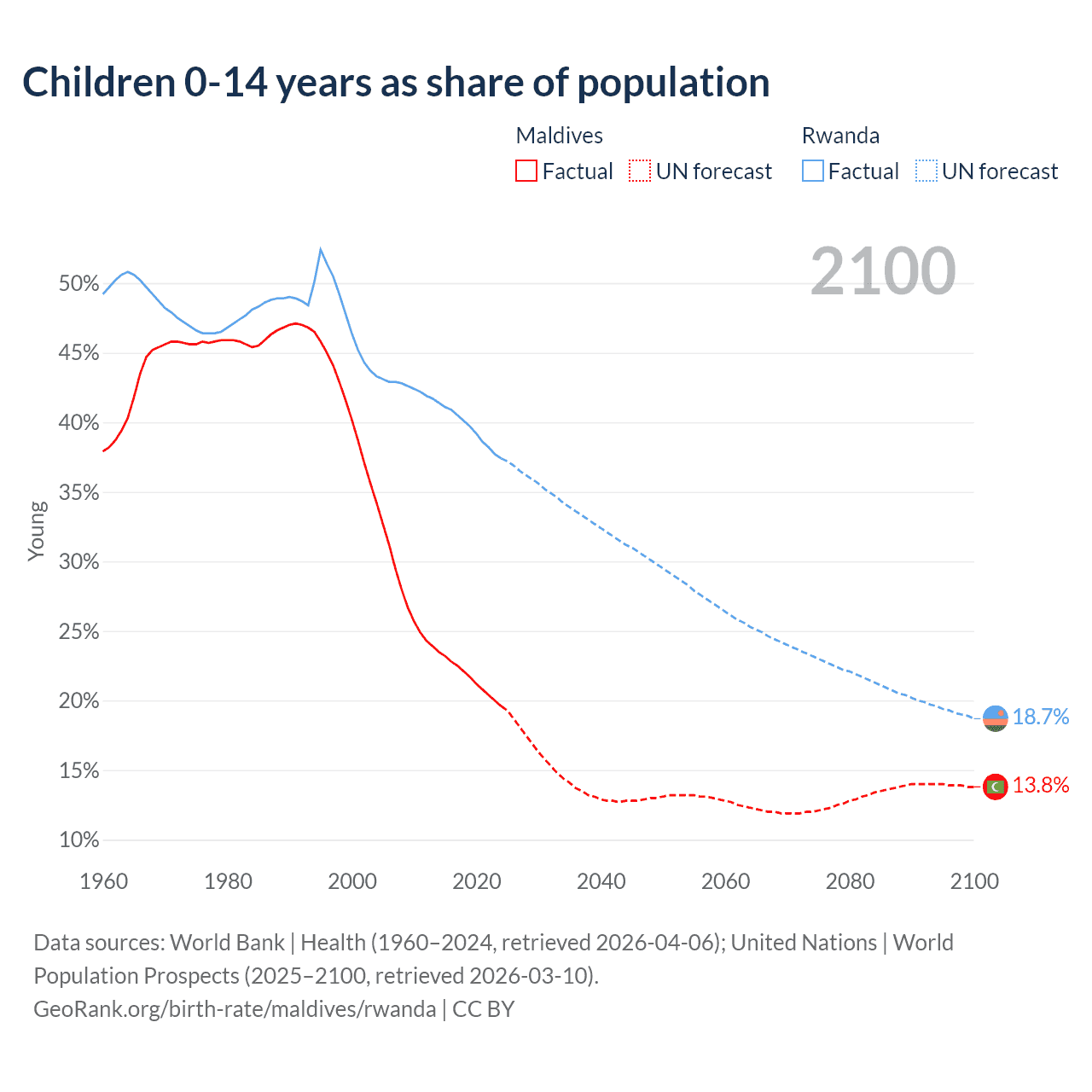 Maldives has an annual birth rate of 11 births per 1,000 people, compared to 28.3 for Rwanda. The average number of children a woman is expected to have during her lifetime — the fertility rate, is 1.58 in Maldives and 3.7 in Rwanda — 134.8% difference.