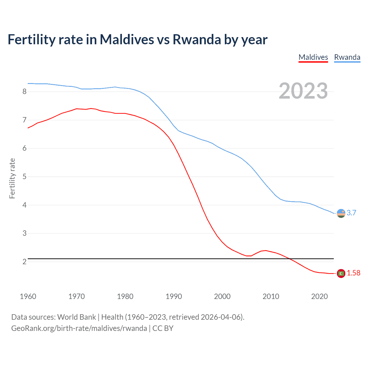 According to the latest available data on birth rates, the fertility rate in Maldives was 1.58 children per woman in 2023, compared to 3.7 in Rwanda in 2023. The replacement level is considered to be 2.1 children per woman.