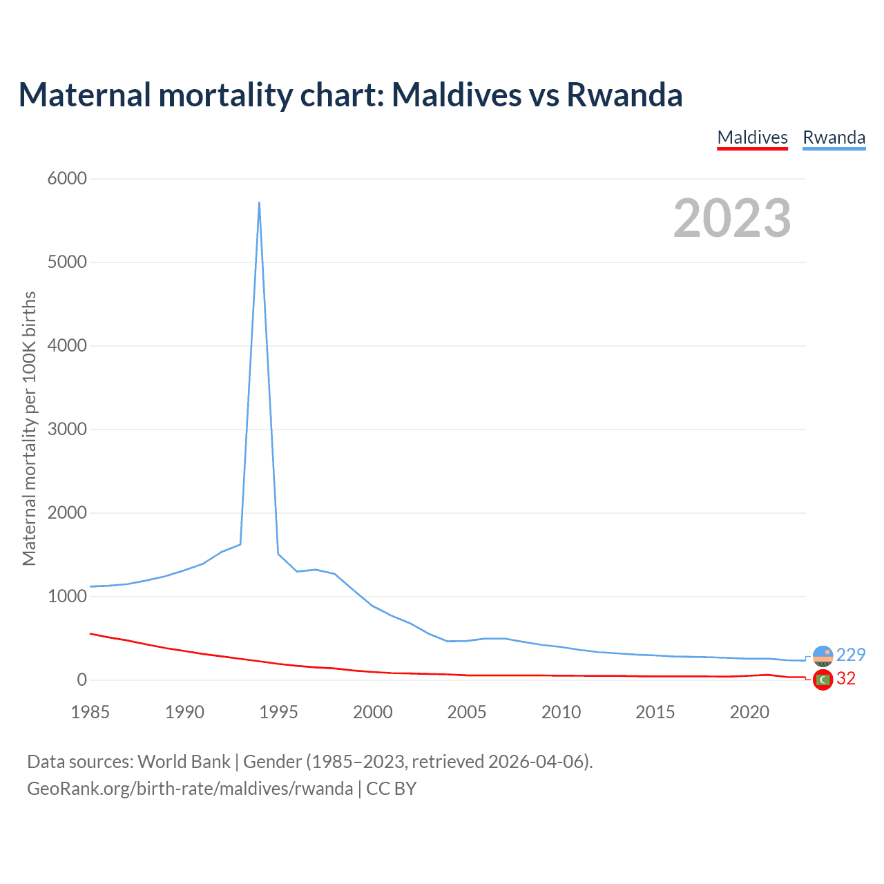 The maternal mortality rate, which is the probability of dying during childbirth or within 42 days of pregnancy termination, is 32 deaths per 100,000 live births in Maldives, compared to 229 deaths in Rwanda.