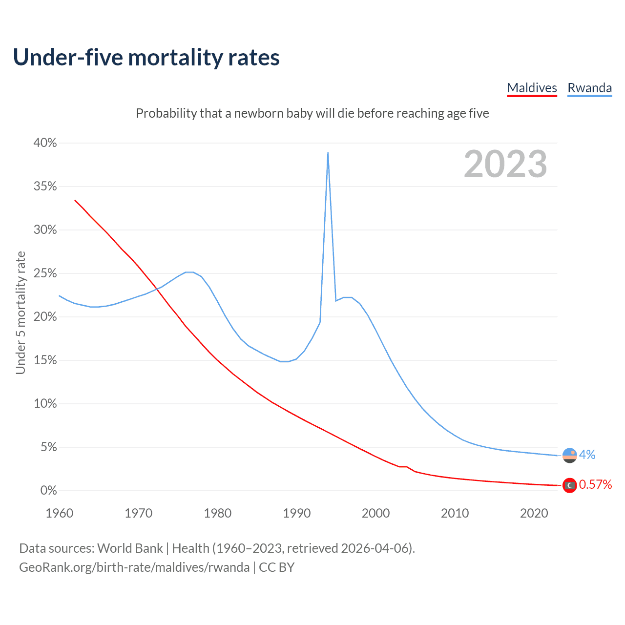 The chance that a newborn baby will die before reaching age five is 0.57% in Maldives and 4% in Rwanda. Above is a chart with historical data on under-five mortality rates.