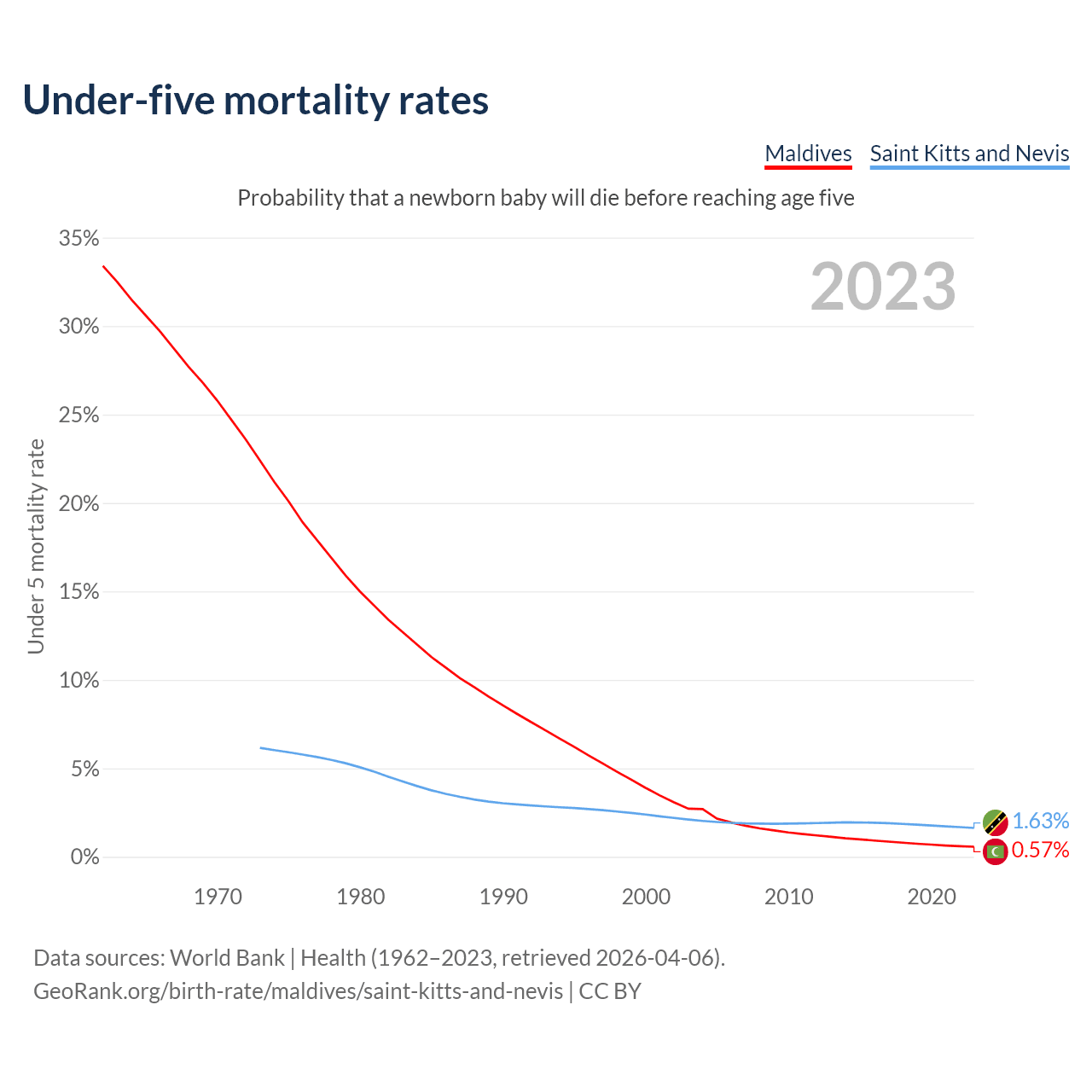 The chance that a newborn baby will die before reaching age five is 0.57% in Maldives and 1.63% in Saint Kitts and Nevis. Above is a chart with historical data on under-five mortality rates.