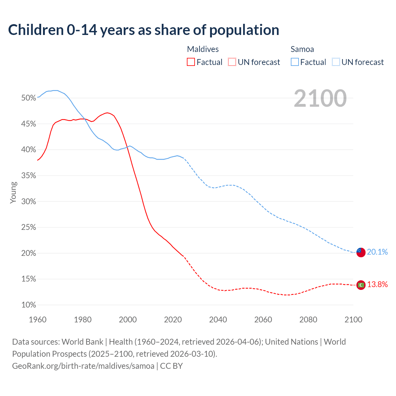According to the latest available data on birth rates, the fertility rate in Maldives was 1.58 children per woman in 2023, compared to 3.83 in Samoa in 2023. The replacement level is considered to be 2.1 children per woman.