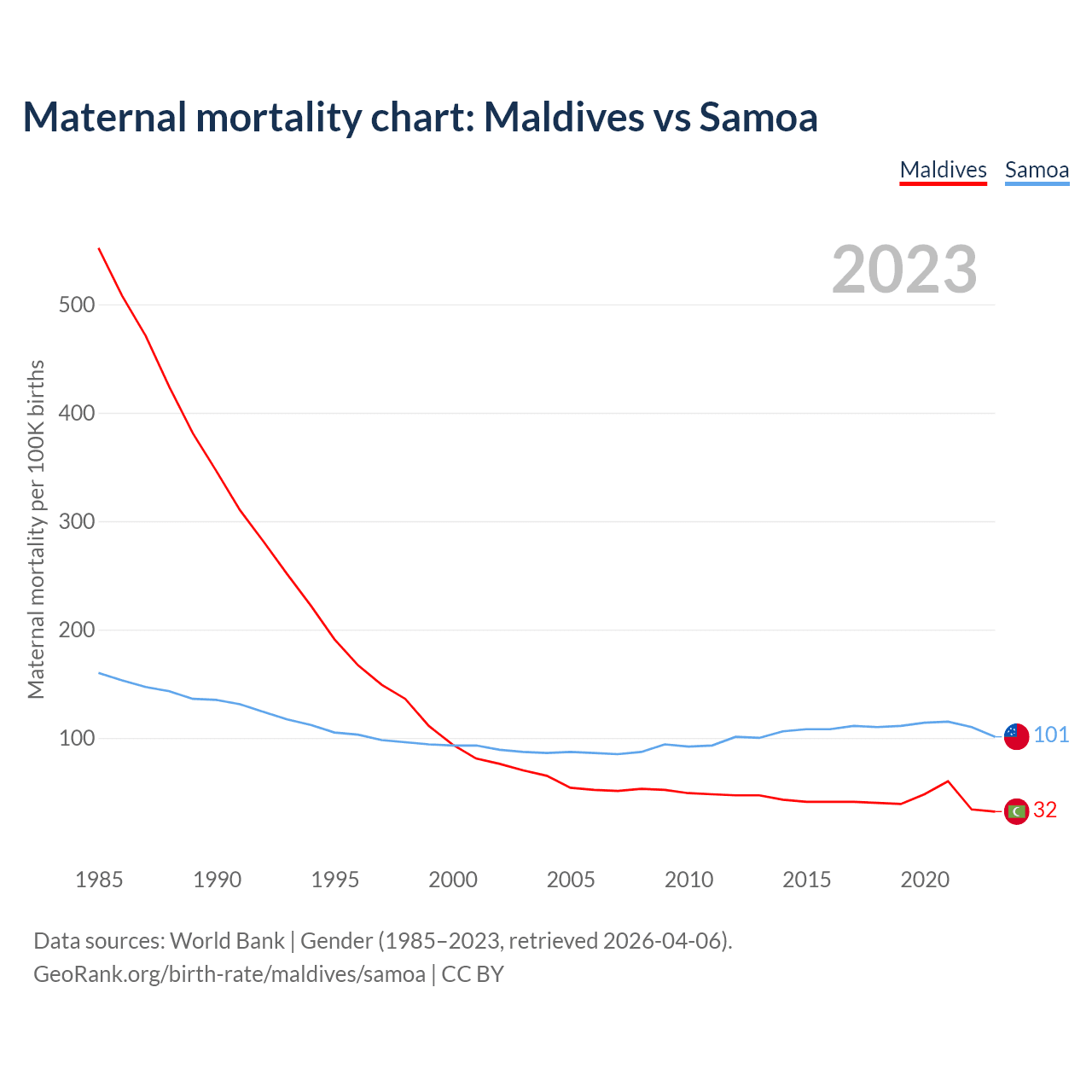 The maternal mortality rate, which is the probability of dying during childbirth or within 42 days of pregnancy termination, is 32 deaths per 100,000 live births in Maldives, compared to 101 deaths in Samoa.