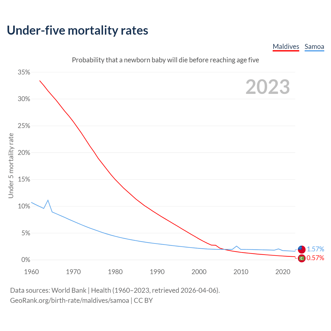 The chance that a newborn baby will die before reaching age five is 0.57% in Maldives and 1.57% in Samoa. Above is a chart with historical data on under-five mortality rates.