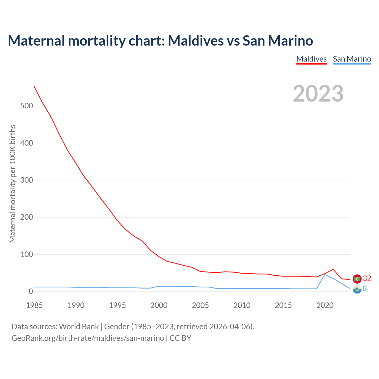The maternal mortality rate, which is the probability of dying during childbirth or within 42 days of pregnancy termination, is 32 deaths per 100,000 live births in Maldives, compared to 8 deaths in San Marino.