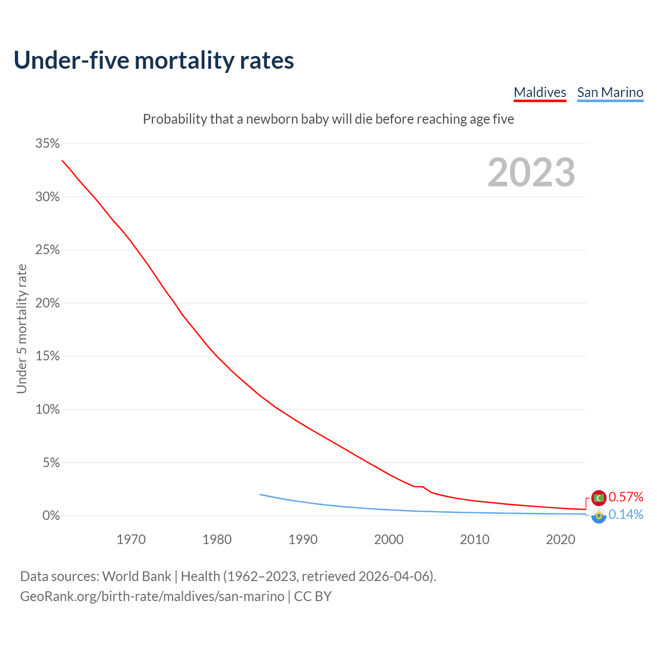 The chance that a newborn baby will die before reaching age five is 0.57% in Maldives and 0.14% in San Marino. Above is a chart with historical data on under-five mortality rates.