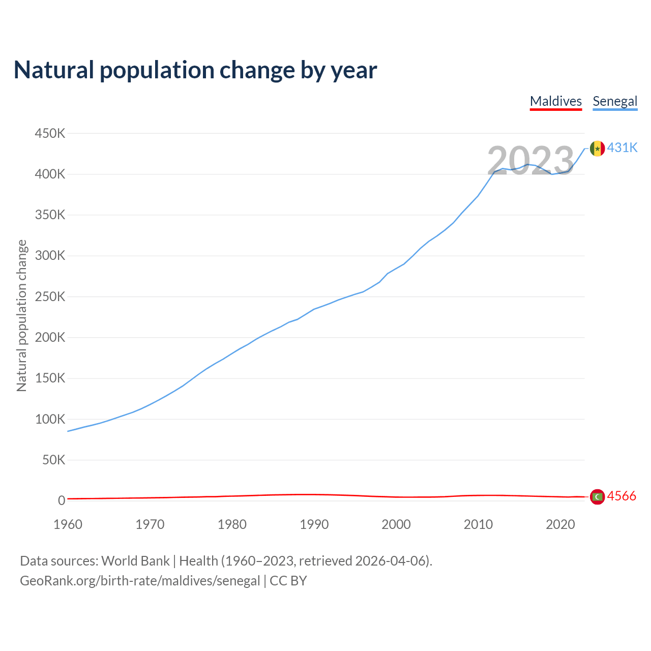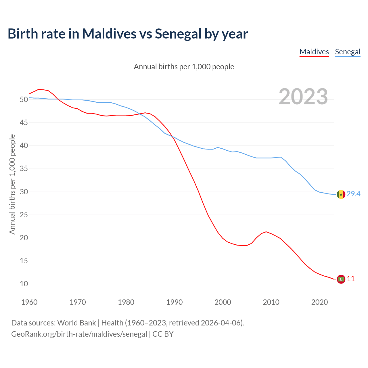 Maldives has an annual birth rate of 11 births per 1,000 people, compared to 29.4 for Senegal. The average number of children a woman is expected to have during her lifetime — the fertility rate, is 1.58 in Maldives and 3.82 in Senegal — 142.4% difference.