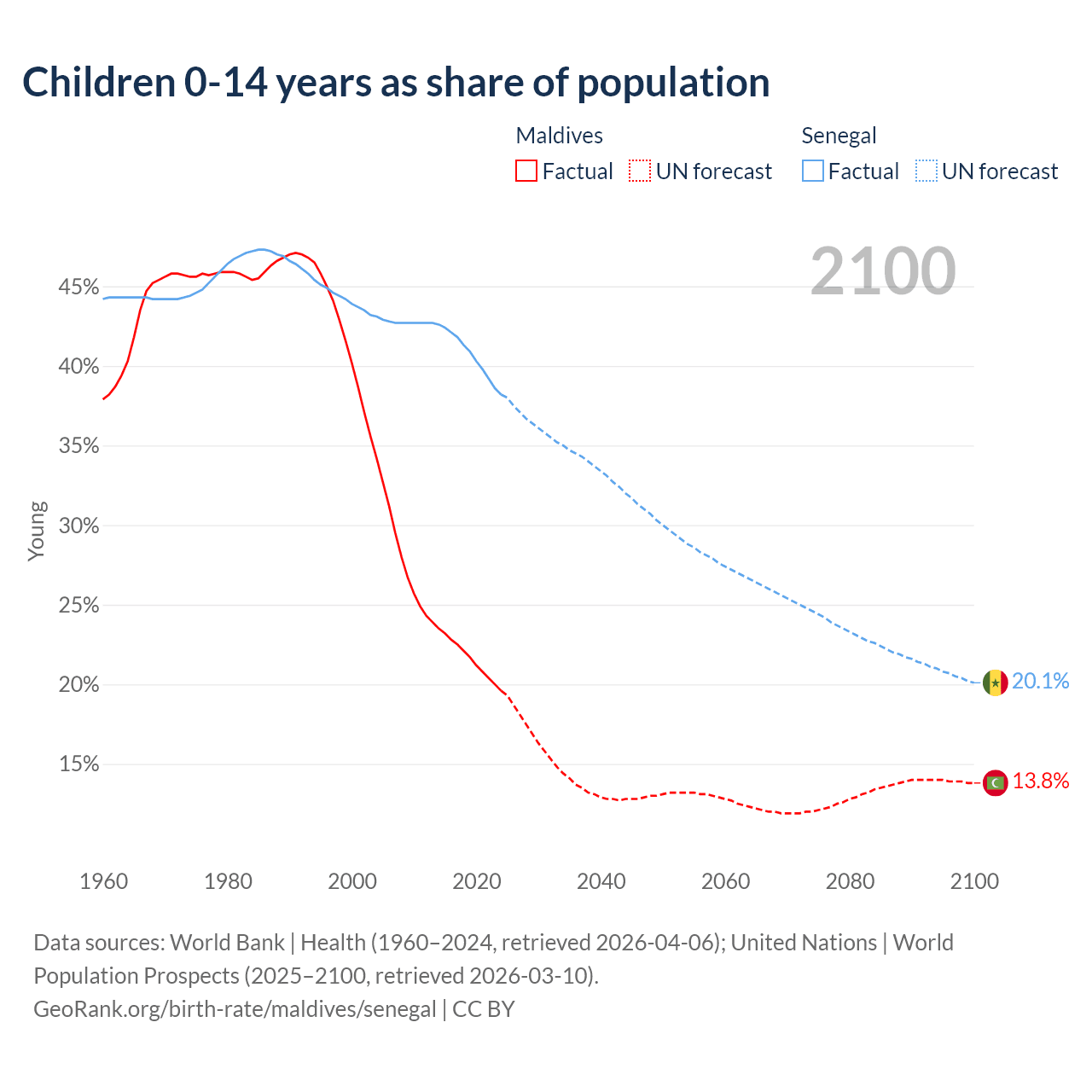 According to the latest available data on birth rates, the fertility rate in Maldives was 1.58 children per woman in 2023, compared to 3.82 in Senegal in 2023. The replacement level is considered to be 2.1 children per woman.