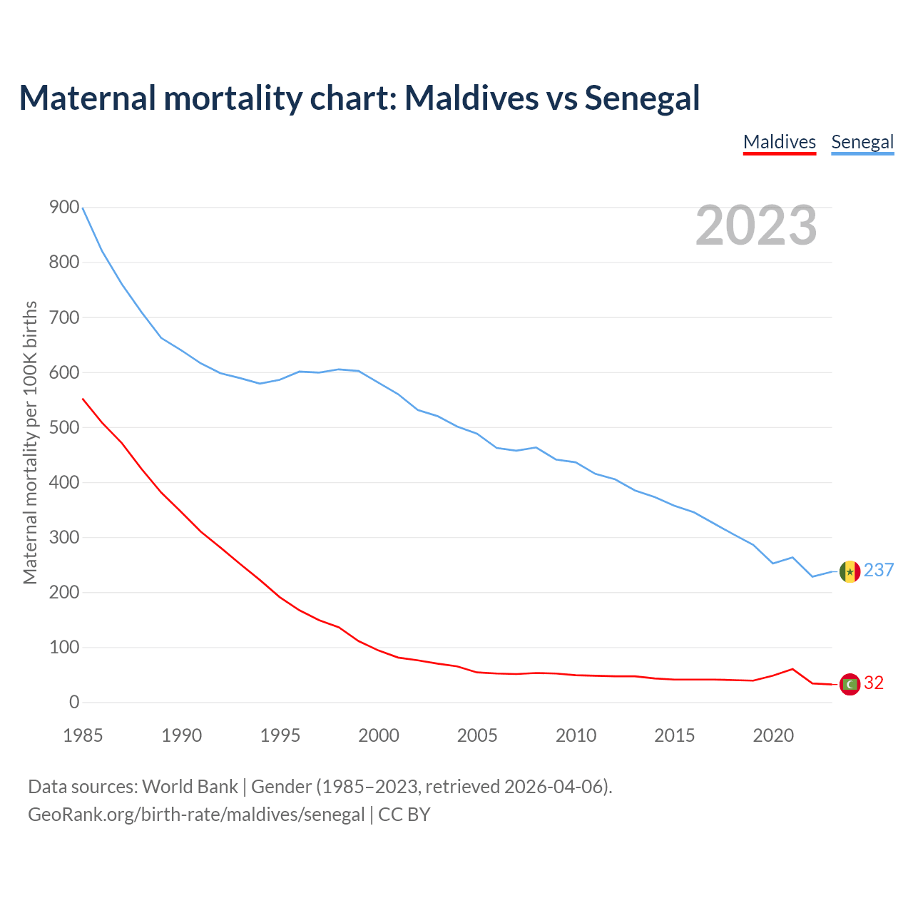 The maternal mortality rate, which is the probability of dying during childbirth or within 42 days of pregnancy termination, is 32 deaths per 100,000 live births in Maldives, compared to 237 deaths in Senegal.