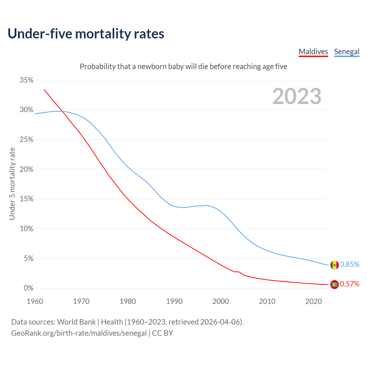 The chance that a newborn baby will die before reaching age five is 0.57% in Maldives and 3.85% in Senegal. Above is a chart with historical data on under-five mortality rates.