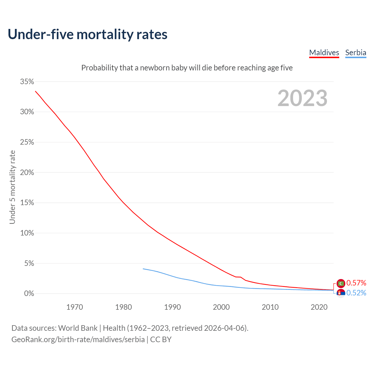 The chance that a newborn baby will die before reaching age five is 0.57% in Maldives and 0.52% in Serbia. Above is a chart with historical data on under-five mortality rates.