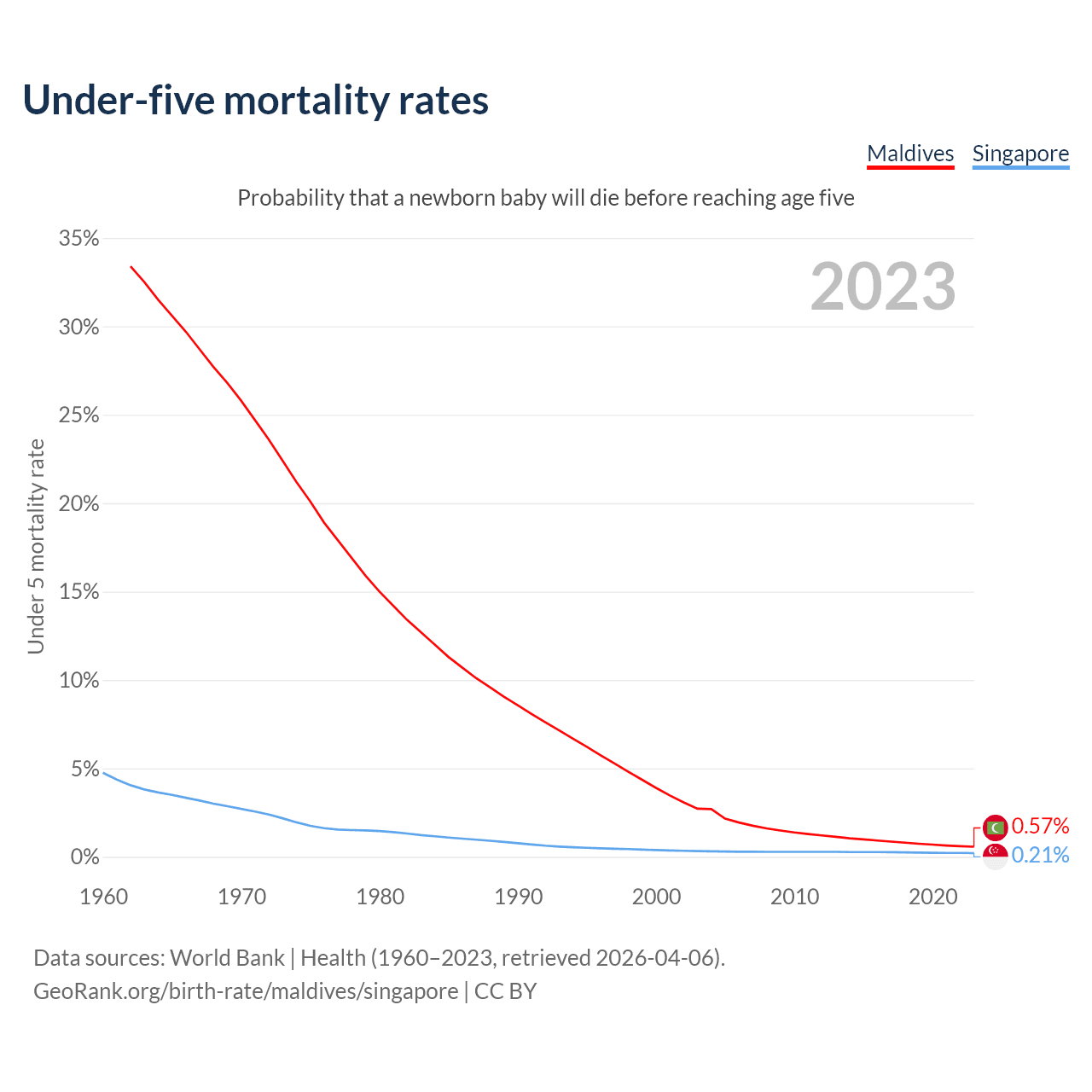 The chance that a newborn baby will die before reaching age five is 0.57% in Maldives and 0.21% in Singapore. Above is a chart with historical data on under-five mortality rates.