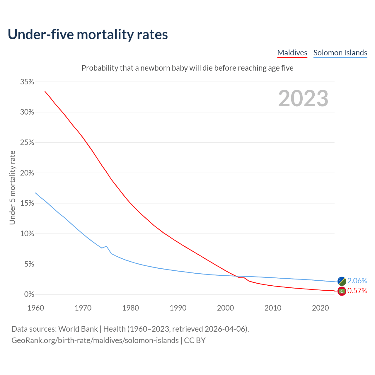 The chance that a newborn baby will die before reaching age five is 0.57% in Maldives and 2.06% in the Solomon Islands. Above is a chart with historical data on under-five mortality rates.