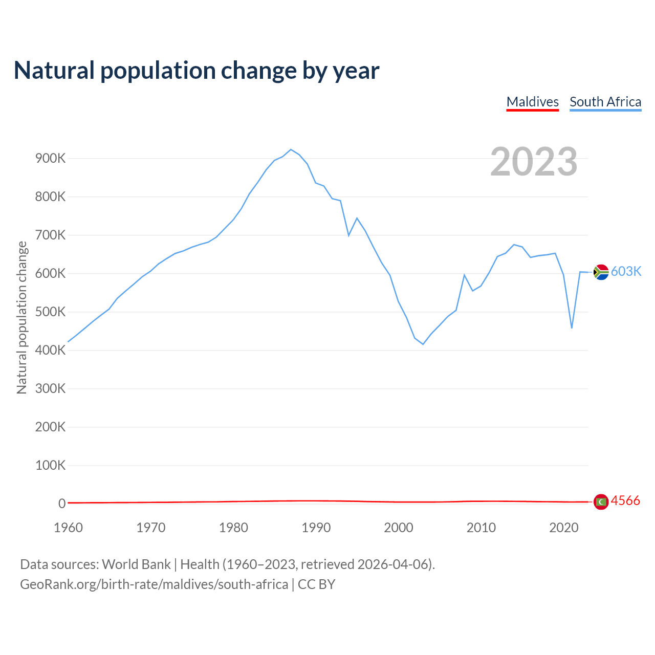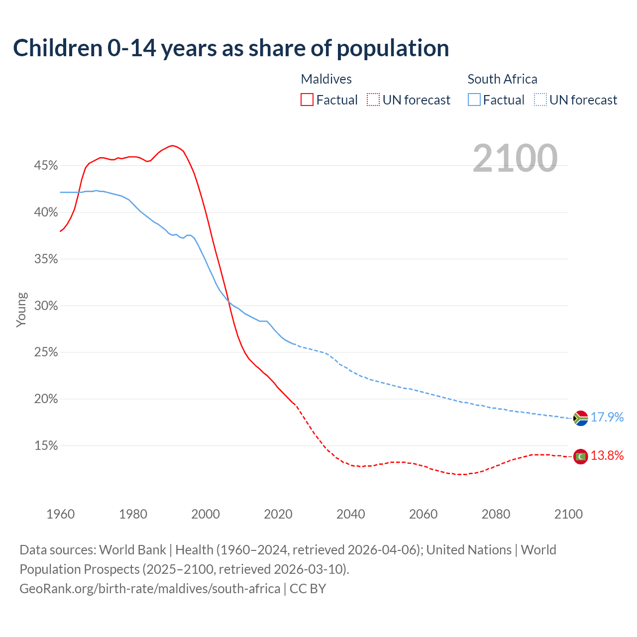 According to the latest available data on birth rates, the fertility rate in Maldives was 1.58 children per woman in 2023, compared to 2.22 in South Africa in 2023. The replacement level is considered to be 2.1 children per woman.