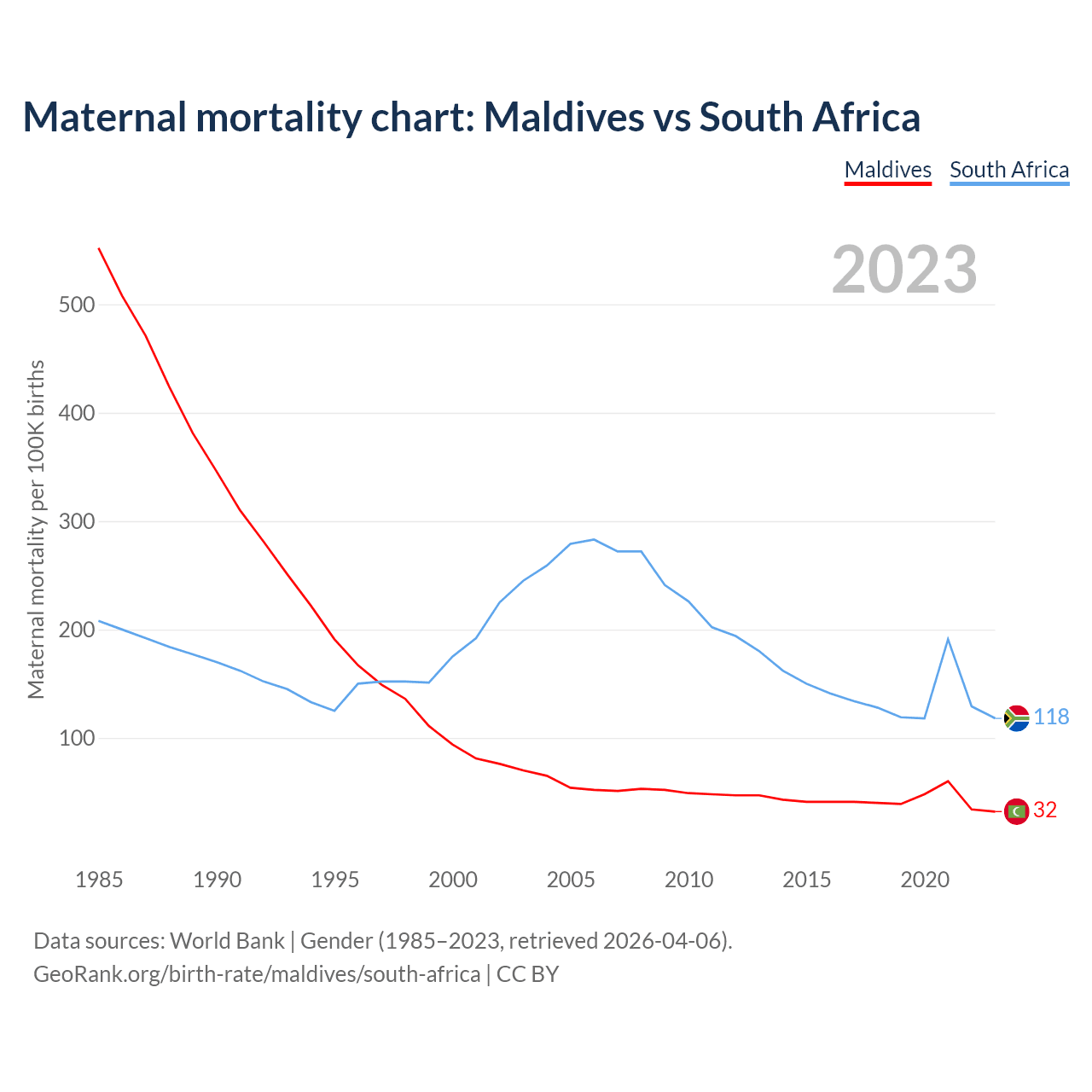 The maternal mortality rate, which is the probability of dying during childbirth or within 42 days of pregnancy termination, is 32 deaths per 100,000 live births in Maldives, compared to 118 deaths in South Africa.