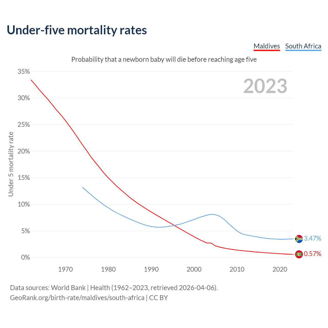 The chance that a newborn baby will die before reaching age five is 0.57% in Maldives and 3.47% in South Africa. Above is a chart with historical data on under-five mortality rates.