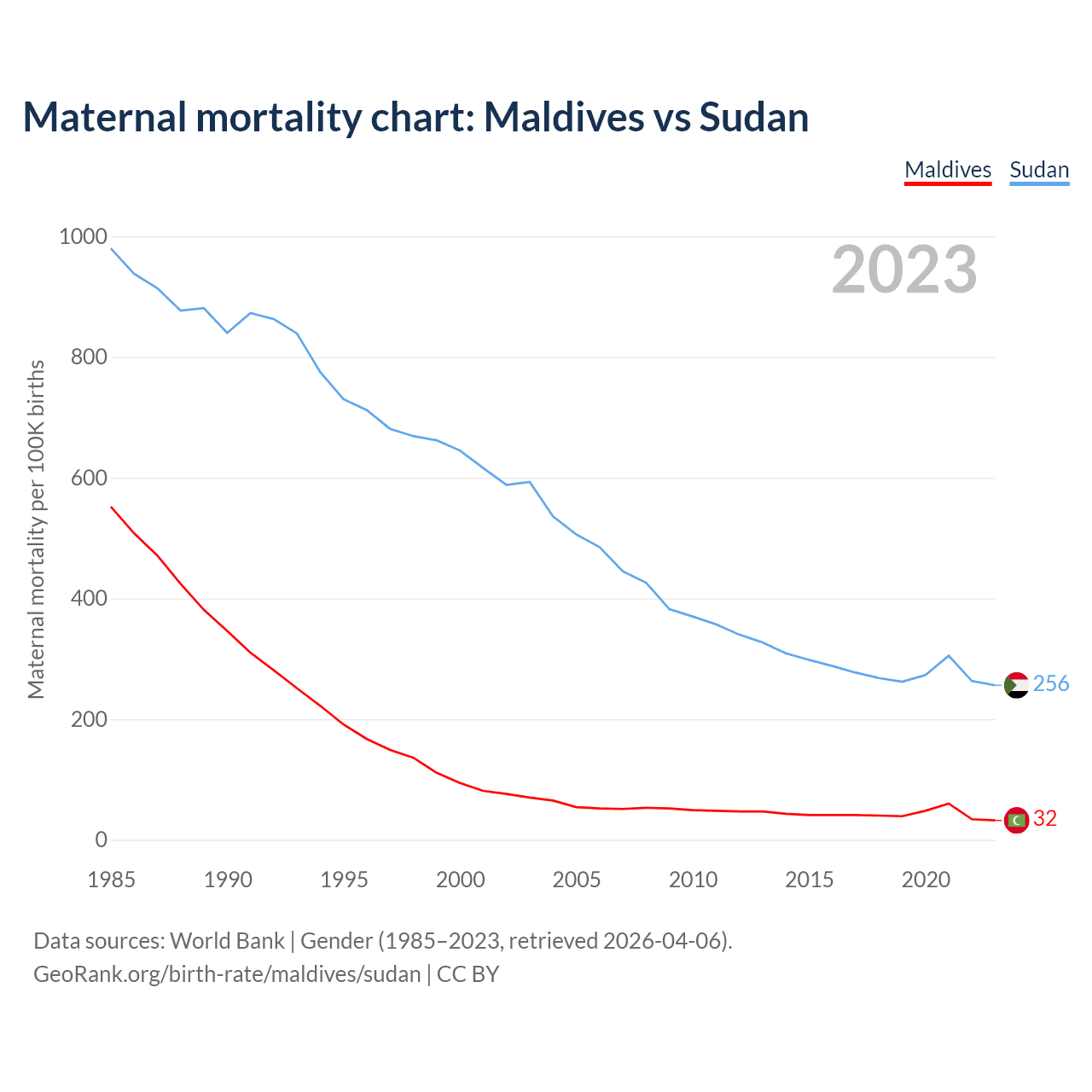 The maternal mortality rate, which is the probability of dying during childbirth or within 42 days of pregnancy termination, is 32 deaths per 100,000 live births in Maldives, compared to 256 deaths in Sudan.