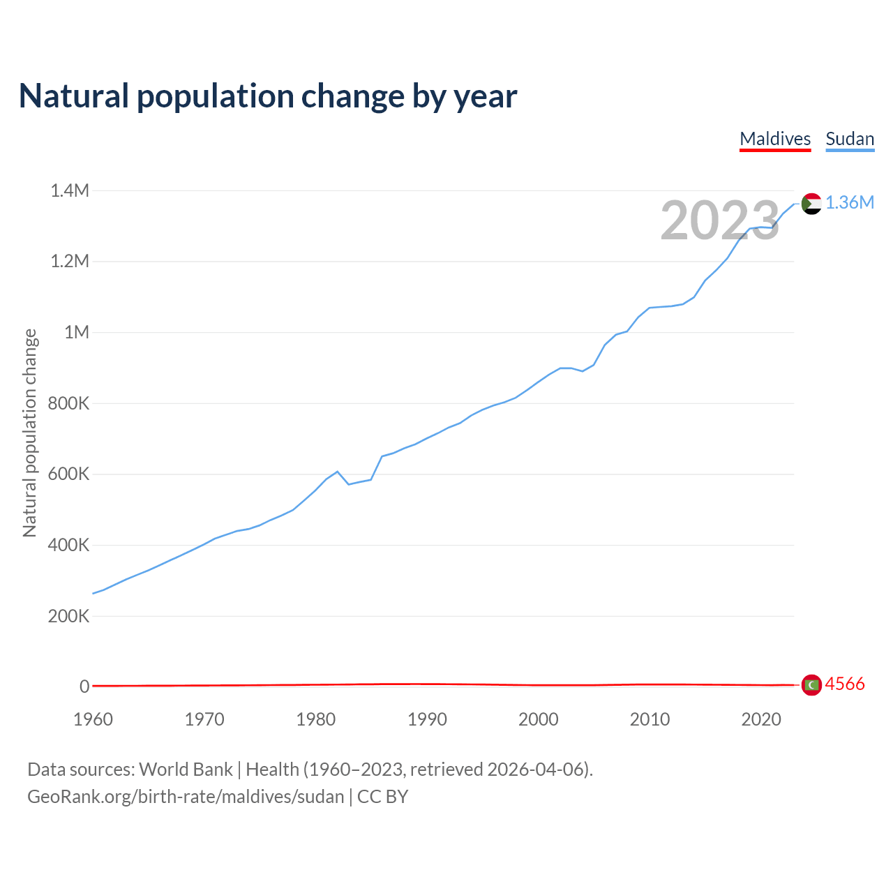 Maldives has an annual birth rate of 11 births per 1,000 people, compared to 33.6 for Sudan. The average number of children a woman is expected to have during her lifetime — the fertility rate, is 1.58 in Maldives and 4.32 in Sudan — 174.5% difference.