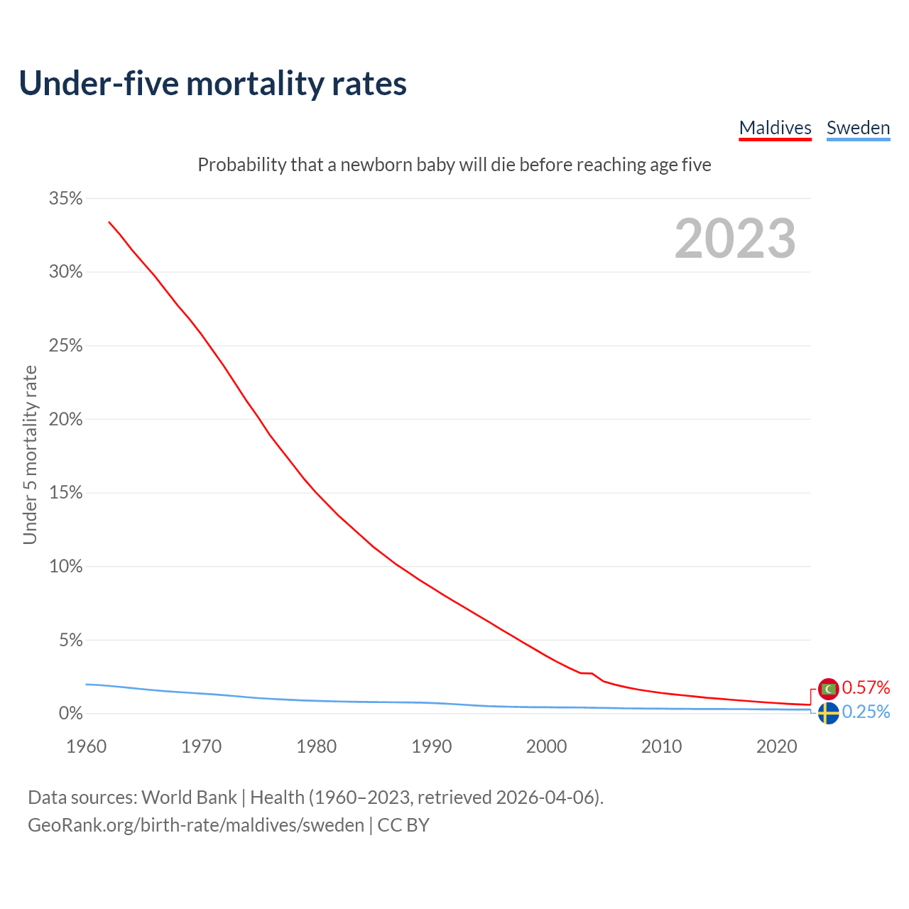 The chance that a newborn baby will die before reaching age five is 0.57% in Maldives and 0.25% in Sweden. Above is a chart with historical data on under-five mortality rates.