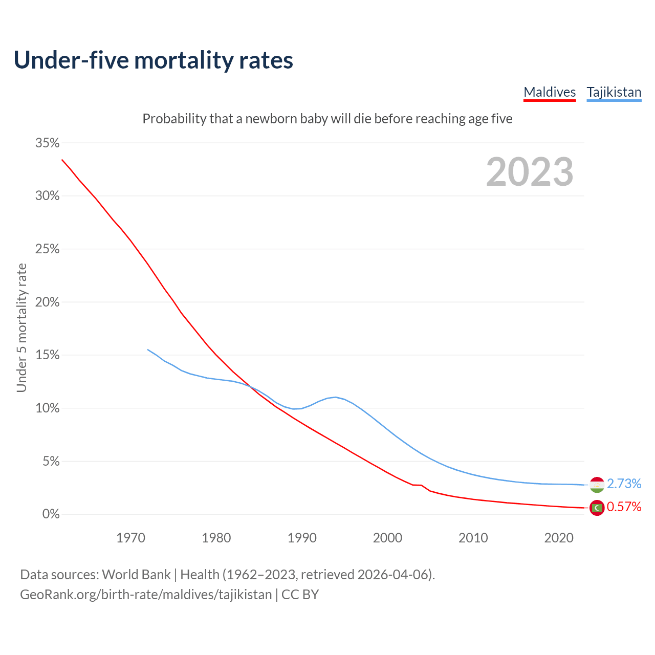The chance that a newborn baby will die before reaching age five is 0.57% in Maldives and 2.73% in Tajikistan. Above is a chart with historical data on under-five mortality rates.