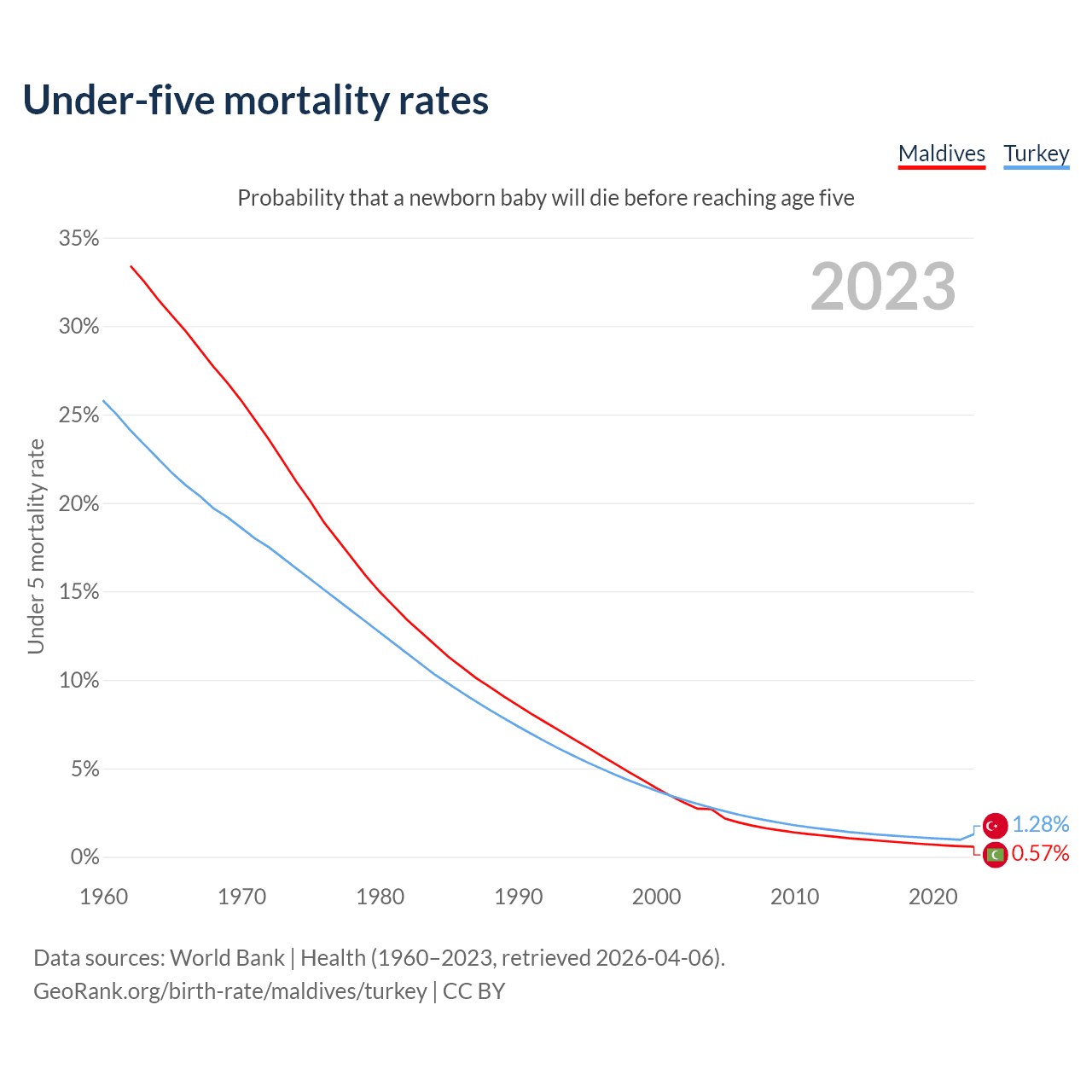 The chance that a newborn baby will die before reaching age five is 0.57% in Maldives and 1.28% in Turkey. Above is a chart with historical data on under-five mortality rates.