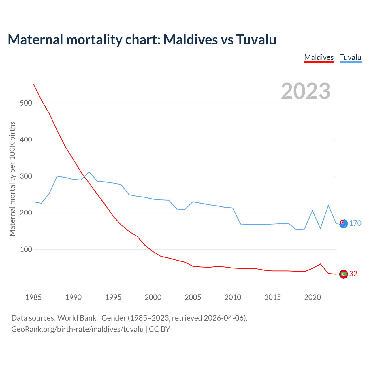 The maternal mortality rate, which is the probability of dying during childbirth or within 42 days of pregnancy termination, is 32 deaths per 100,000 live births in Maldives, compared to 170 deaths in Tuvalu.