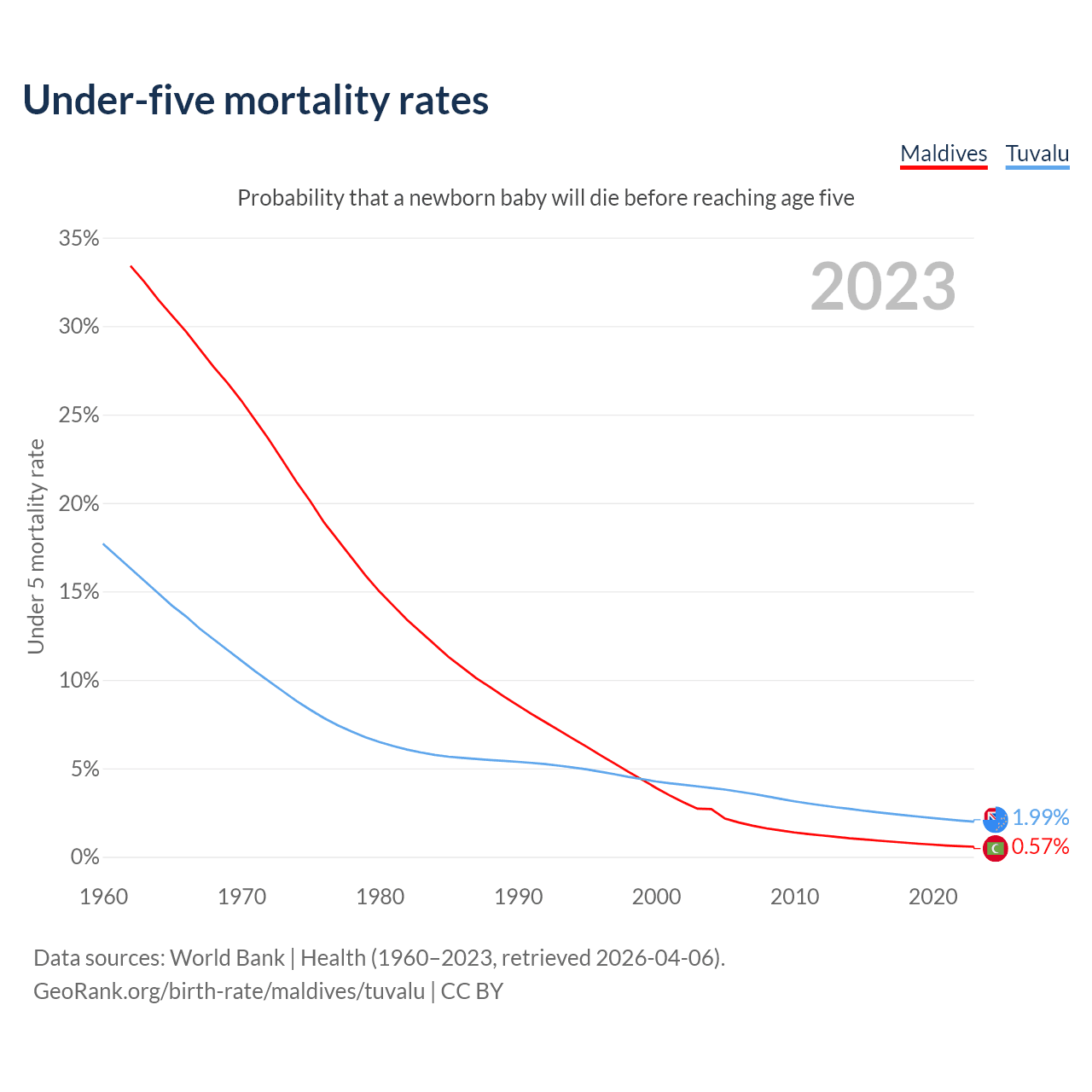 The chance that a newborn baby will die before reaching age five is 0.57% in Maldives and 1.99% in Tuvalu. Above is a chart with historical data on under-five mortality rates.
