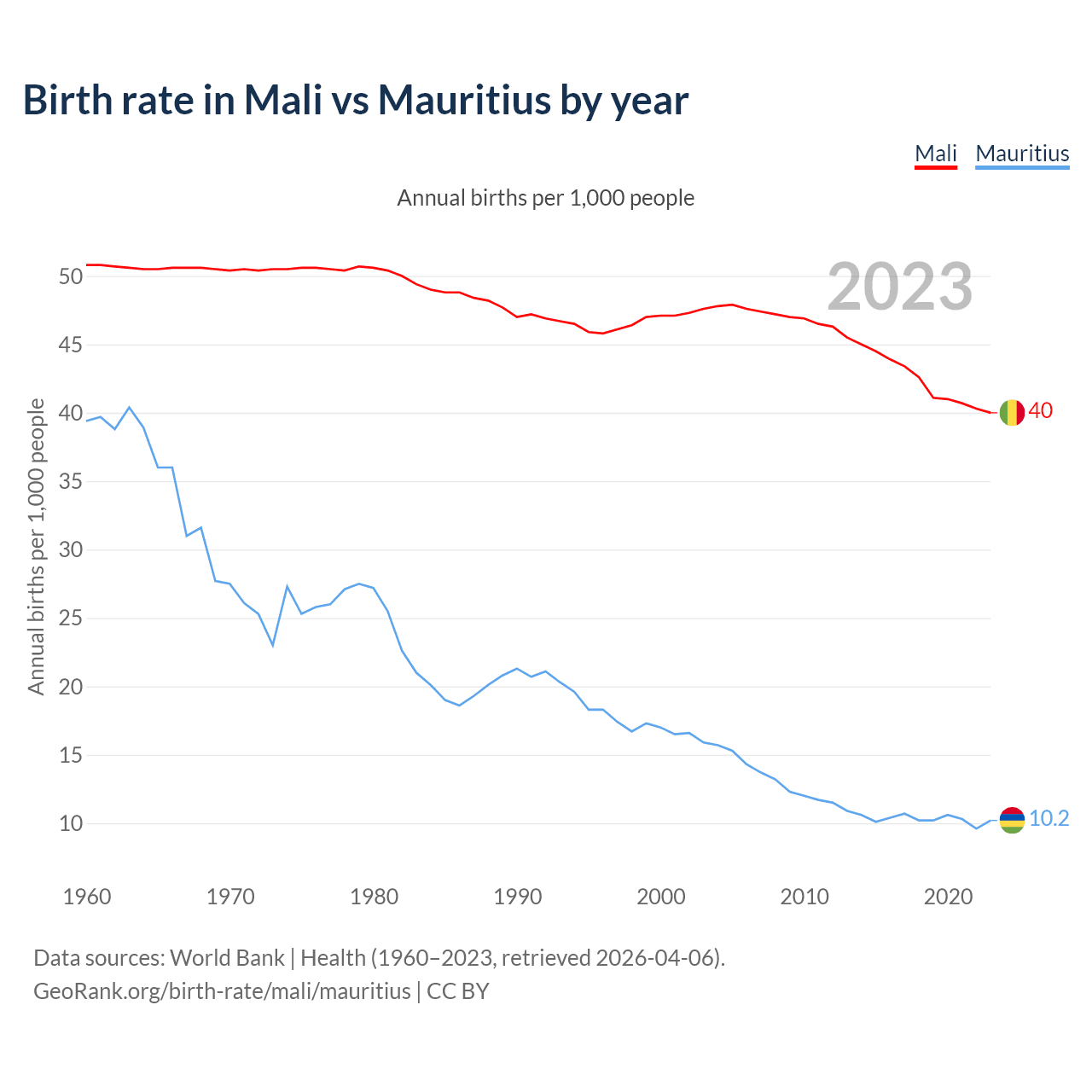 Mali has an annual birth rate of 40 births per 1,000 people, compared to 10.2 for Mauritius. The average number of children a woman is expected to have during her lifetime — the fertility rate, is 5.61 in Mali and 1.39 in Mauritius — 75.2% difference.