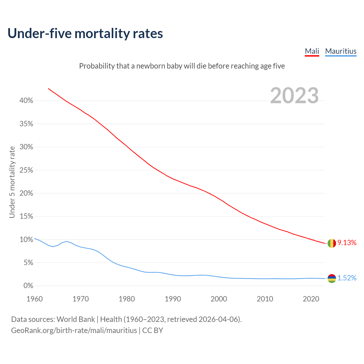 The chance that a newborn baby will die before reaching age five is 9.13% in Mali and 1.52% in Mauritius. Above is a chart with historical data on under-five mortality rates.