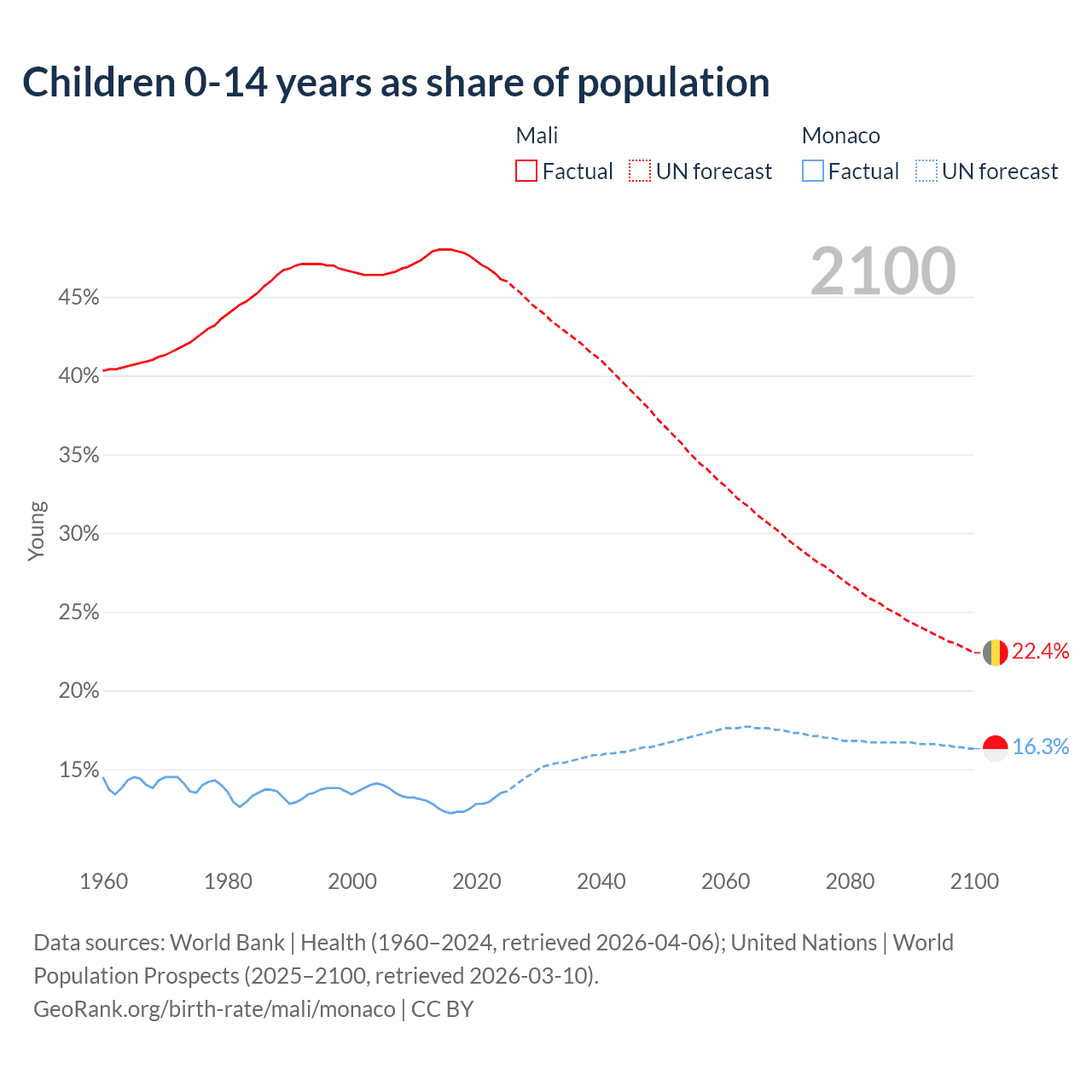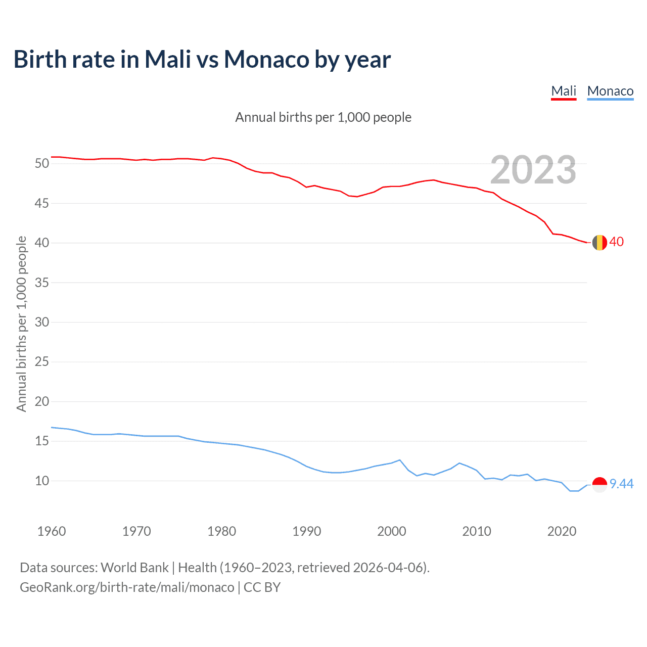 Mali has an annual birth rate of 40 births per 1,000 people, compared to 9.44 for Monaco. The average number of children a woman is expected to have during her lifetime — the fertility rate, is 5.61 in Mali and 2.11 in Monaco — 62.4% difference.