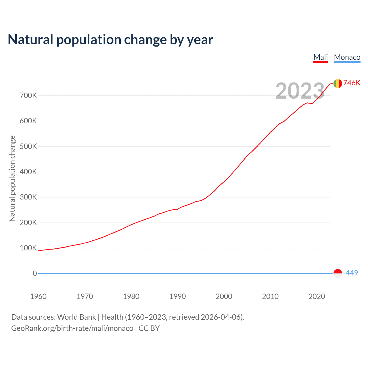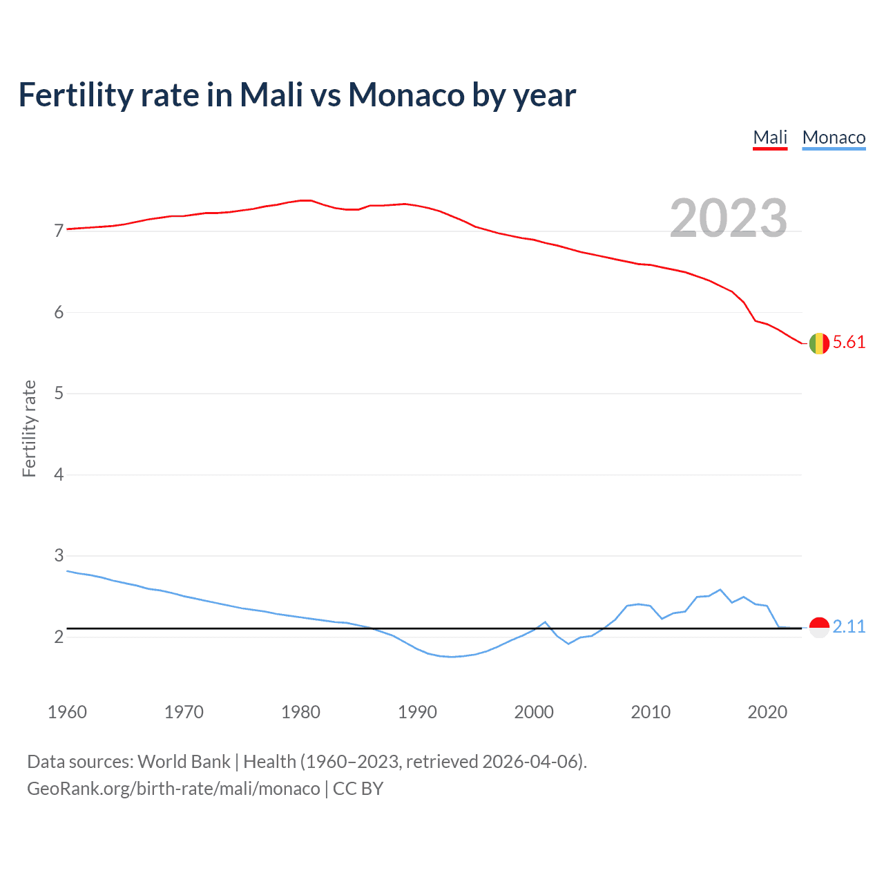 According to the latest available data on birth rates, the fertility rate in Mali was 5.61 children per woman in 2023, compared to 2.11 in Monaco in 2023. The replacement level is considered to be 2.1 children per woman.