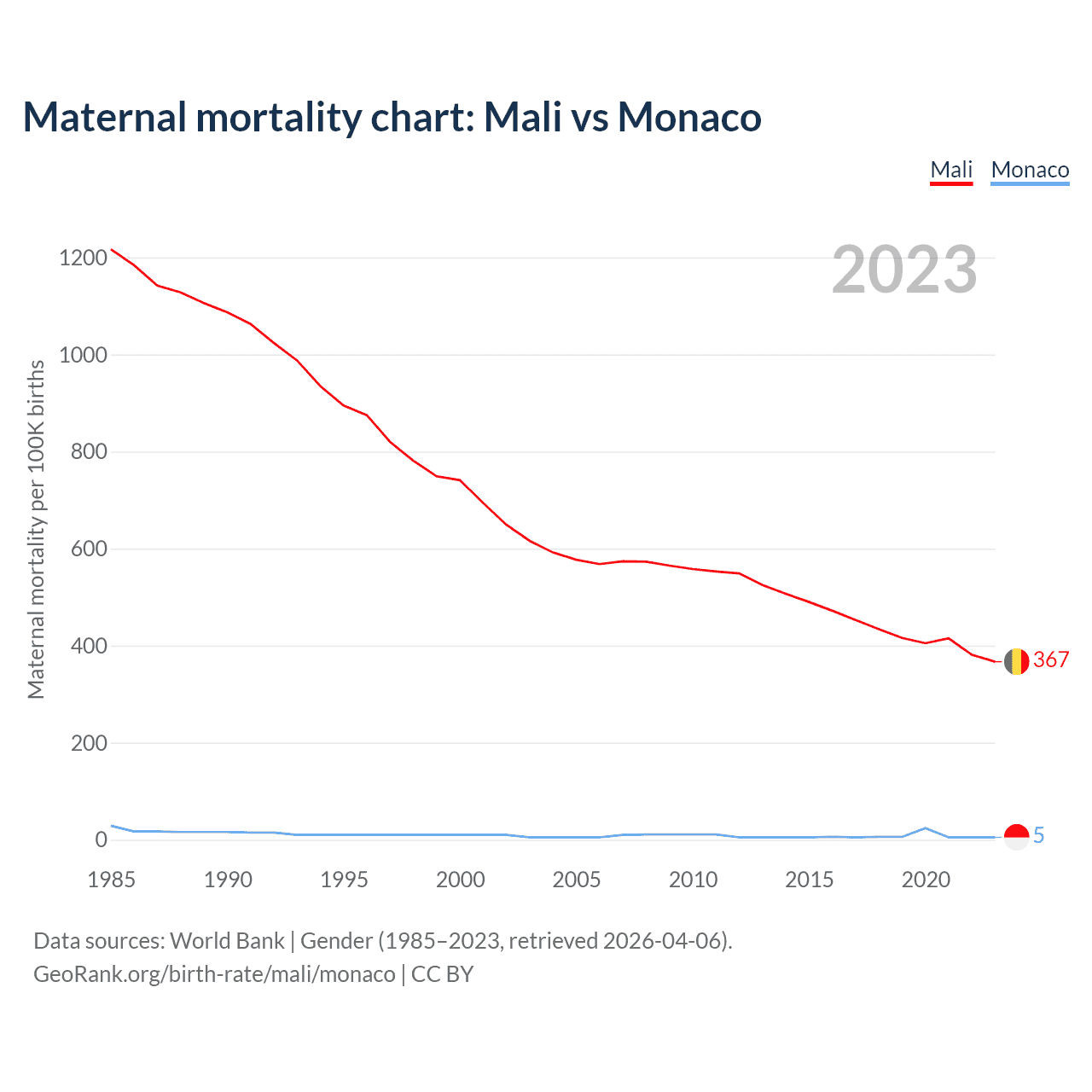 The maternal mortality rate, which is the probability of dying during childbirth or within 42 days of pregnancy termination, is 367 deaths per 100,000 live births in Mali, compared to 5 deaths in Monaco.