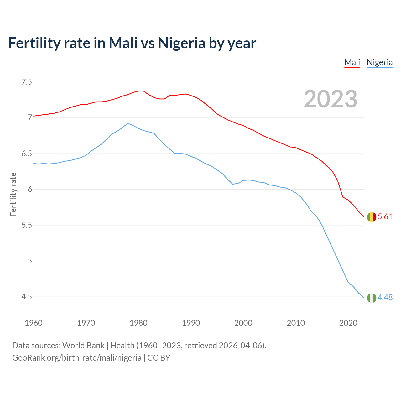 1960 vs 2023, the fertility rate has decreased by 20% in Mali and by 29.6% in Nigeria — in 1960, it was 7.02 and 6.36, respectively.