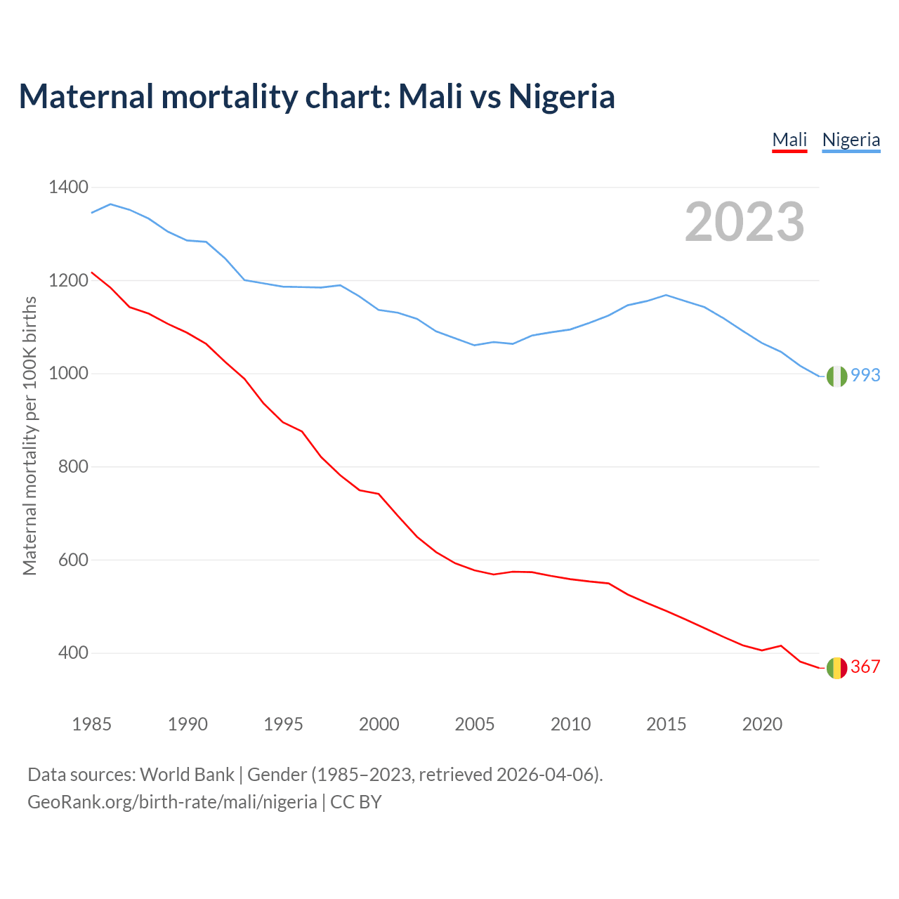 The maternal mortality rate, which is the probability of dying during childbirth or within 42 days of pregnancy termination, is 367 deaths per 100,000 live births in Mali, compared to 993 deaths in Nigeria.