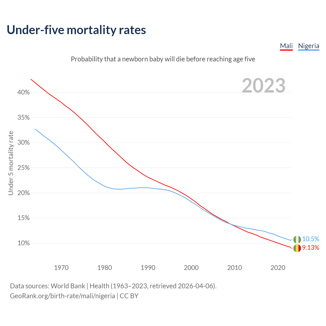 The chance that a newborn baby will die before reaching age five is 9.13% in Mali and 10.5% in Nigeria. Above is a chart with historical data on under-five mortality rates.