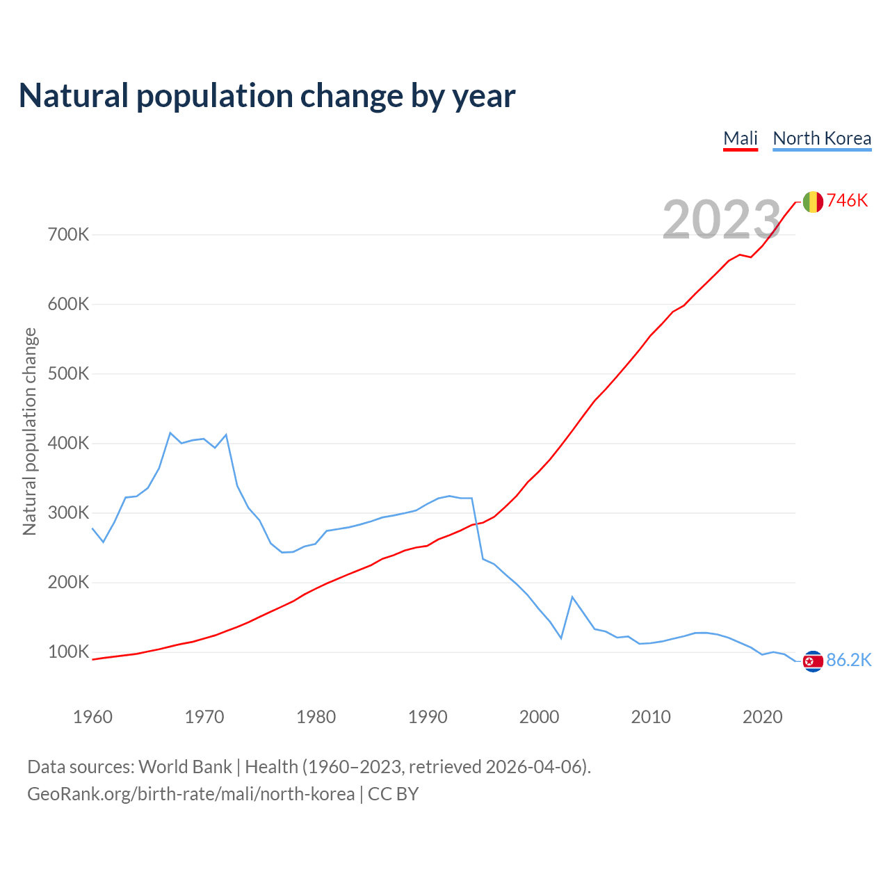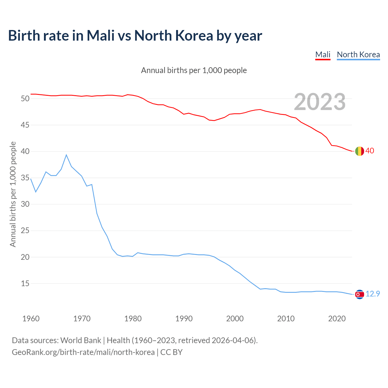 Mali has an annual birth rate of 40 births per 1,000 people, compared to 12.9 for North Korea. The average number of children a woman is expected to have during her lifetime — the fertility rate, is 5.61 in Mali and 1.78 in North Korea — 68.3% difference.