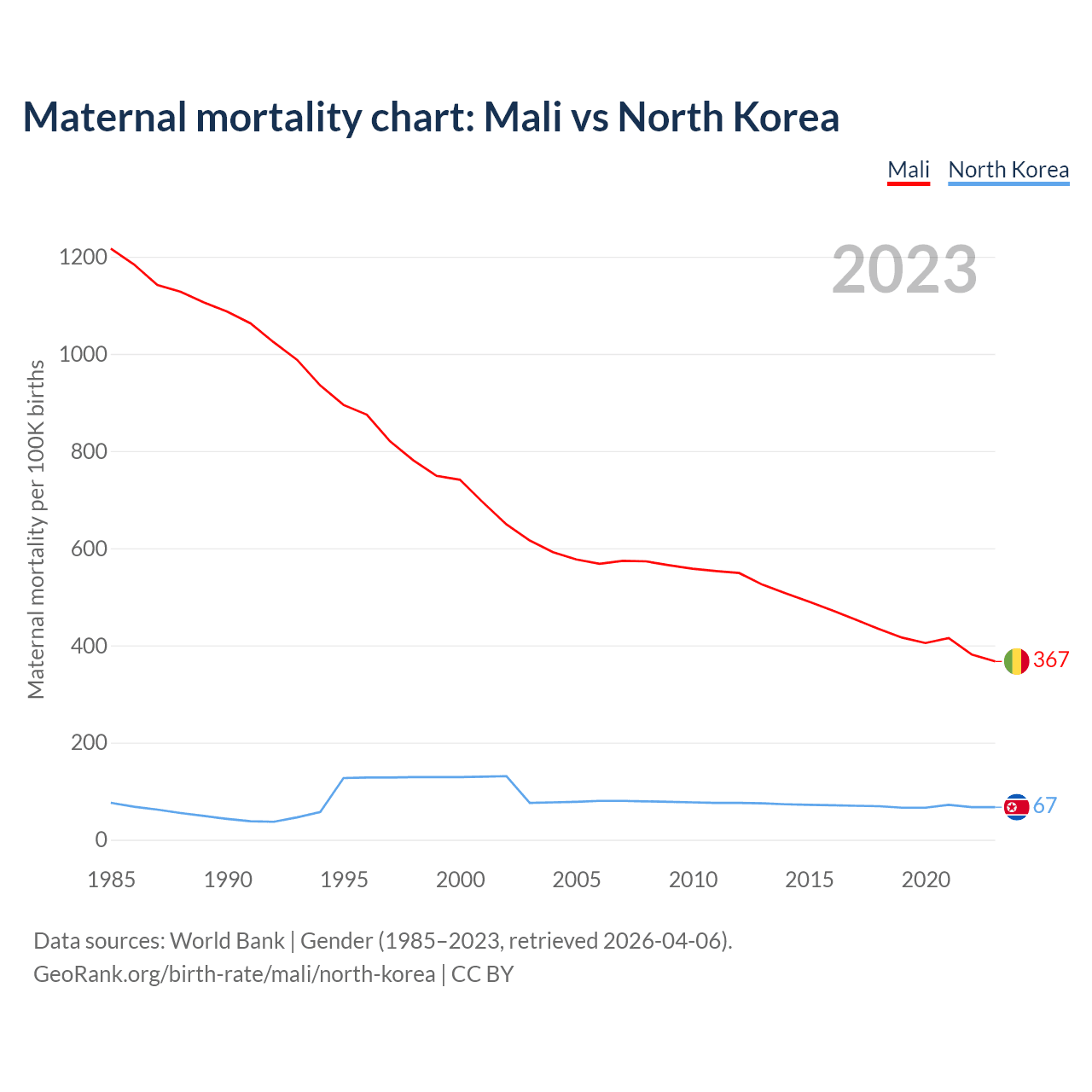 The maternal mortality rate, which is the probability of dying during childbirth or within 42 days of pregnancy termination, is 367 deaths per 100,000 live births in Mali, compared to 67 deaths in North Korea.
