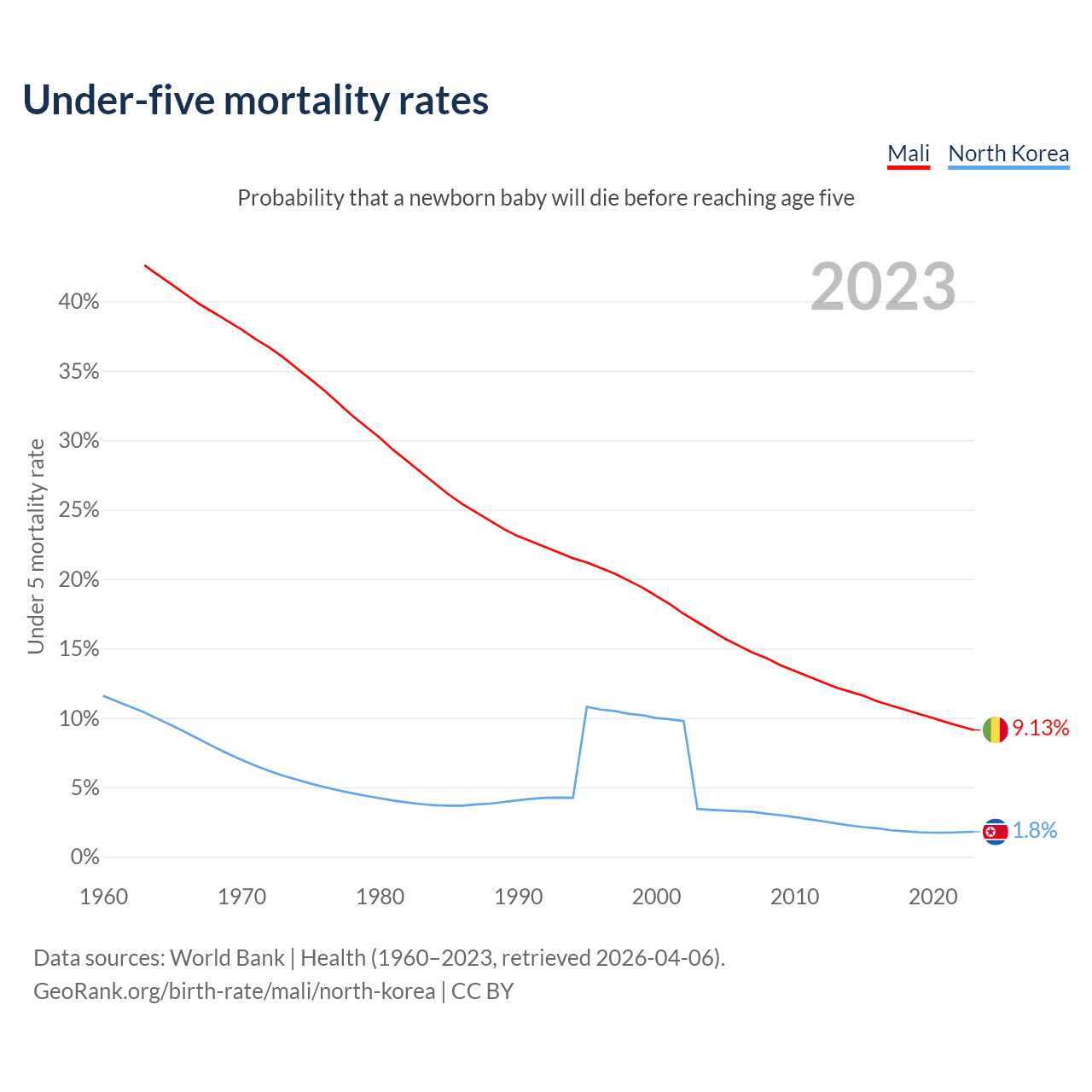 The chance that a newborn baby will die before reaching age five is 9.13% in Mali and 1.8% in North Korea. Above is a chart with historical data on under-five mortality rates.
