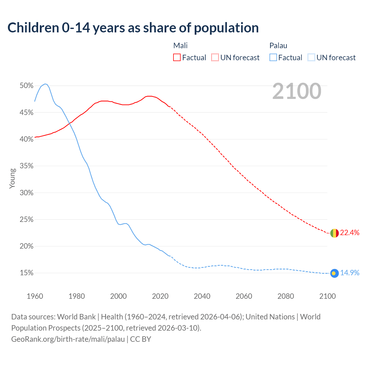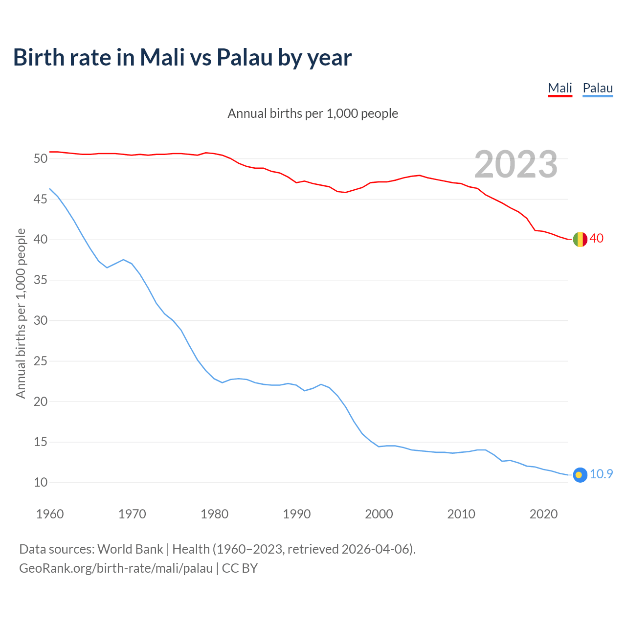 Mali has an annual birth rate of 40 births per 1,000 people, compared to 10.9 for Palau. The average number of children a woman is expected to have during her lifetime — the fertility rate, is 5.61 in Mali and 1.91 in Palau — 66% difference.