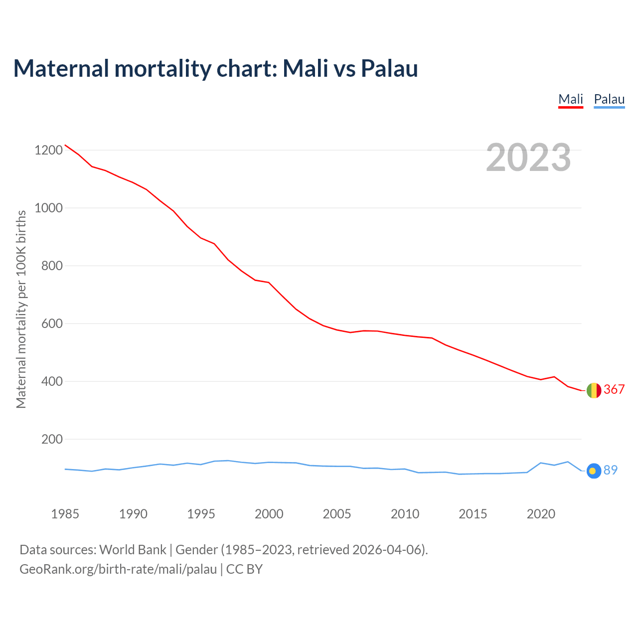 The maternal mortality rate, which is the probability of dying during childbirth or within 42 days of pregnancy termination, is 367 deaths per 100,000 live births in Mali, compared to 89 deaths in Palau.