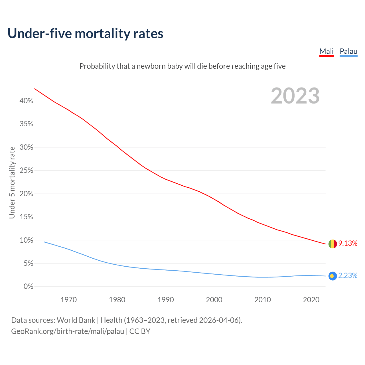 The chance that a newborn baby will die before reaching age five is 9.13% in Mali and 2.23% in Palau. Above is a chart with historical data on under-five mortality rates.