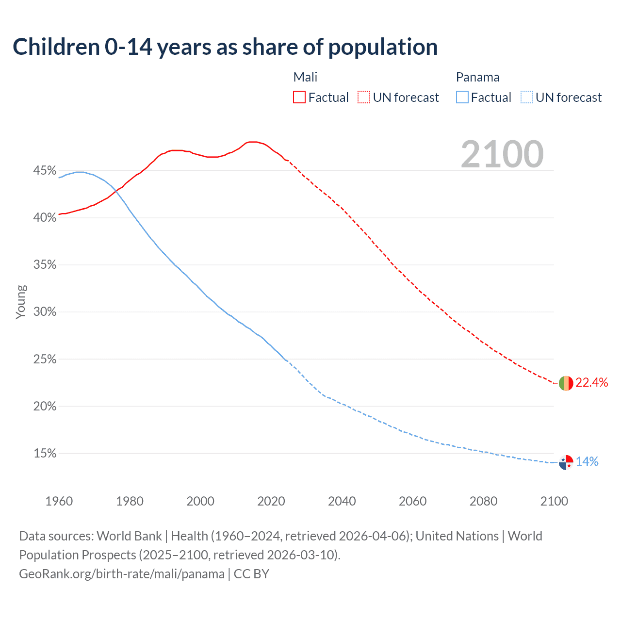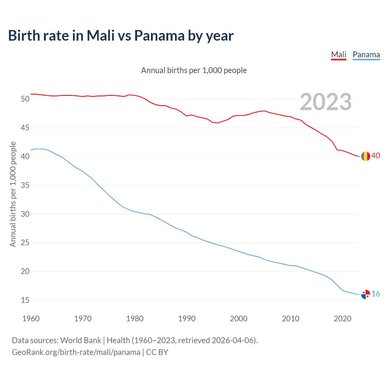 Mali has an annual birth rate of 40 births per 1,000 people, compared to 16 for Panama. The average number of children a woman is expected to have during her lifetime — the fertility rate, is 5.61 in Mali and 2.12 in Panama — 62.3% difference.